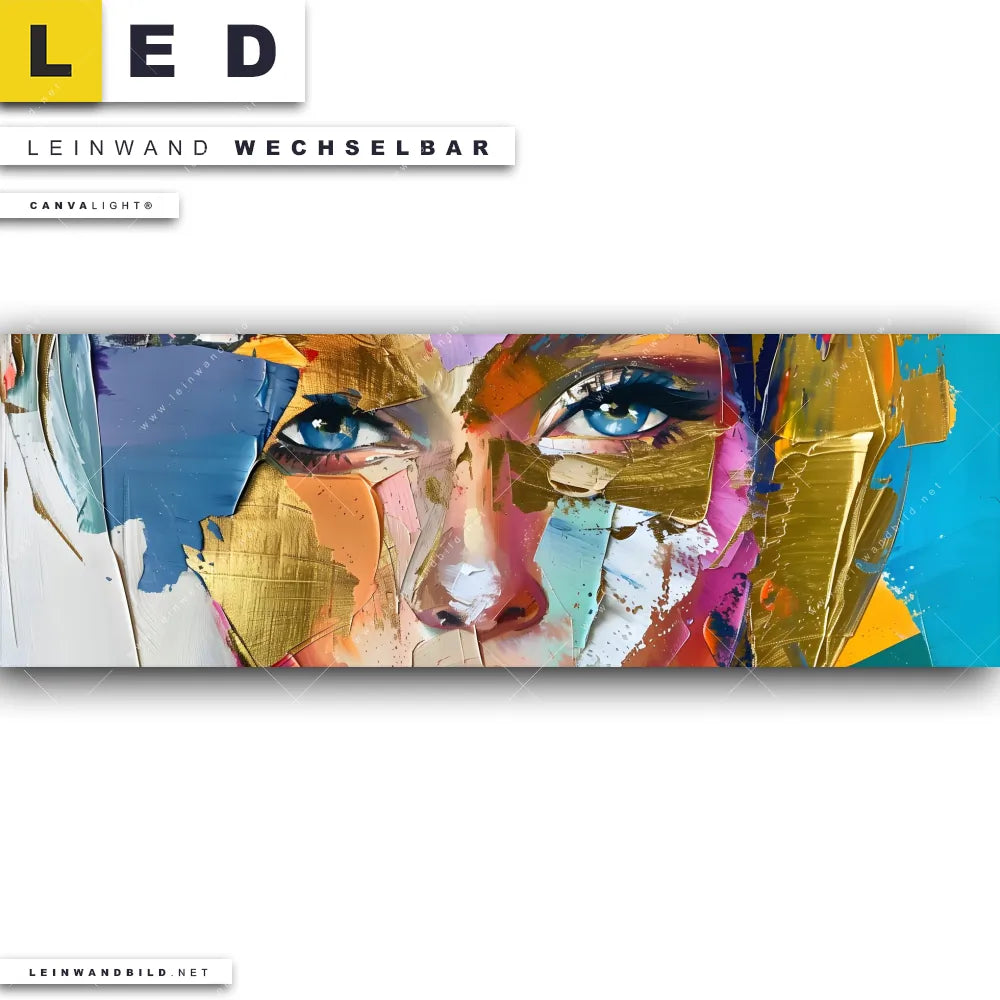 Du bist auf der Suche nach einem Porträts - Menschen LED Leinwandbild im Panorama-Format? Begriffe wie Frauenporträt, Gesicht, Farbexplosion, Farbspritzer, Frau, Porträt haben Dich auf der Suche nach Deinem neuen XXL LED Wandbild mit wechselbarer Leinwand inspiriert? Farben wie Gold, Blau, Lila dürfen auf Deinem neuen extra breiten Leinwand-LED-Bild nicht fehlen und Leuchtbilder im Modern Art, Abstrakt Stil passen perfekt zu Deinem Einrichtungsstil?