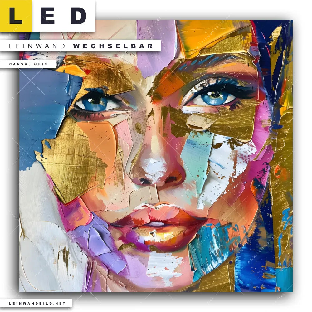 Du bist auf der Suche nach einem Porträts - Menschen LED Leinwandbild im Quadratischen Format? Begriffe wie Frauenporträt, Gesicht, Farbexplosion, Farbspritzer, Frau, Porträt haben Dich auf der Suche nach Deinem neuen XXL LED Wandbild mit wechselbarer Leinwand inspiriert? Farben wie Gold, Blau, Lila dürfen auf Deinem neuen Leinwand-LED-Bild nicht fehlen und Leuchtbilder im Modern Art, Abstrakt Stil passen perfekt zu Deinem Einrichtungsstil?