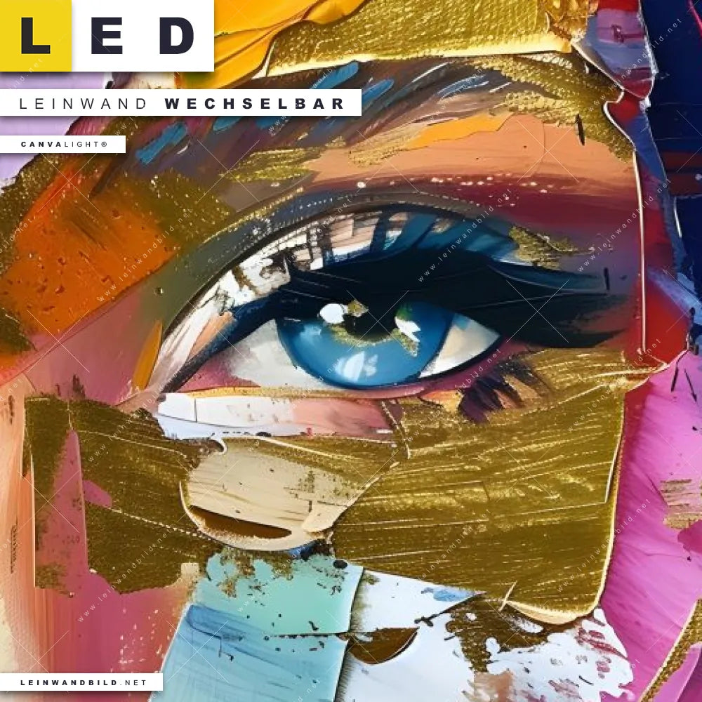 Dann sollte das LED Leinwandbild Canvalight® TEX | Farbexplosion - Porträt Nova | Quadrat den Weg zu Dir finden. Das stufenlos dimmbare Leinwandbild Modernes Porträt mit Gold im steckerfertigen Leuchtrahmen mit Fernbedienung und optionaler Farbtemperatursteuerung fügt sich als Eye-Catcher harmonisch in jedes Friseur - Beauty, Wohnzimmer - Schlafzimmer, Flur - Eingangsbereich Raumkonzept ein.