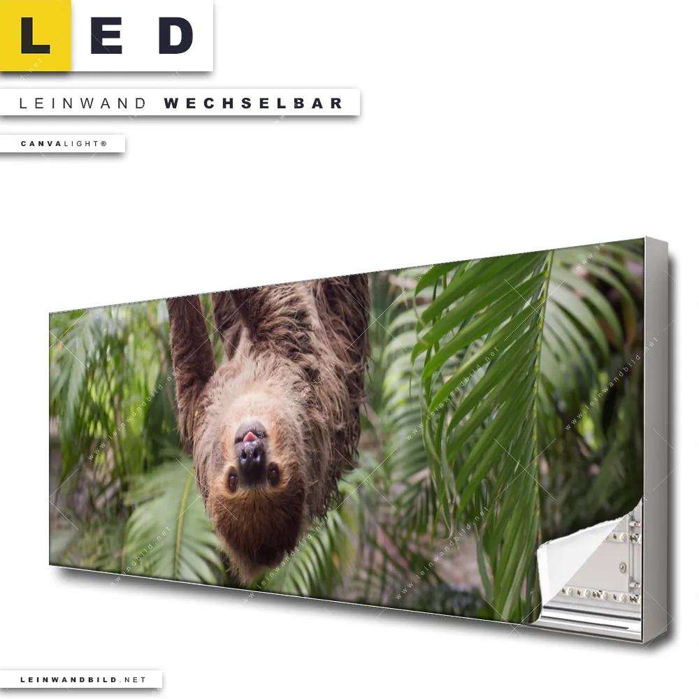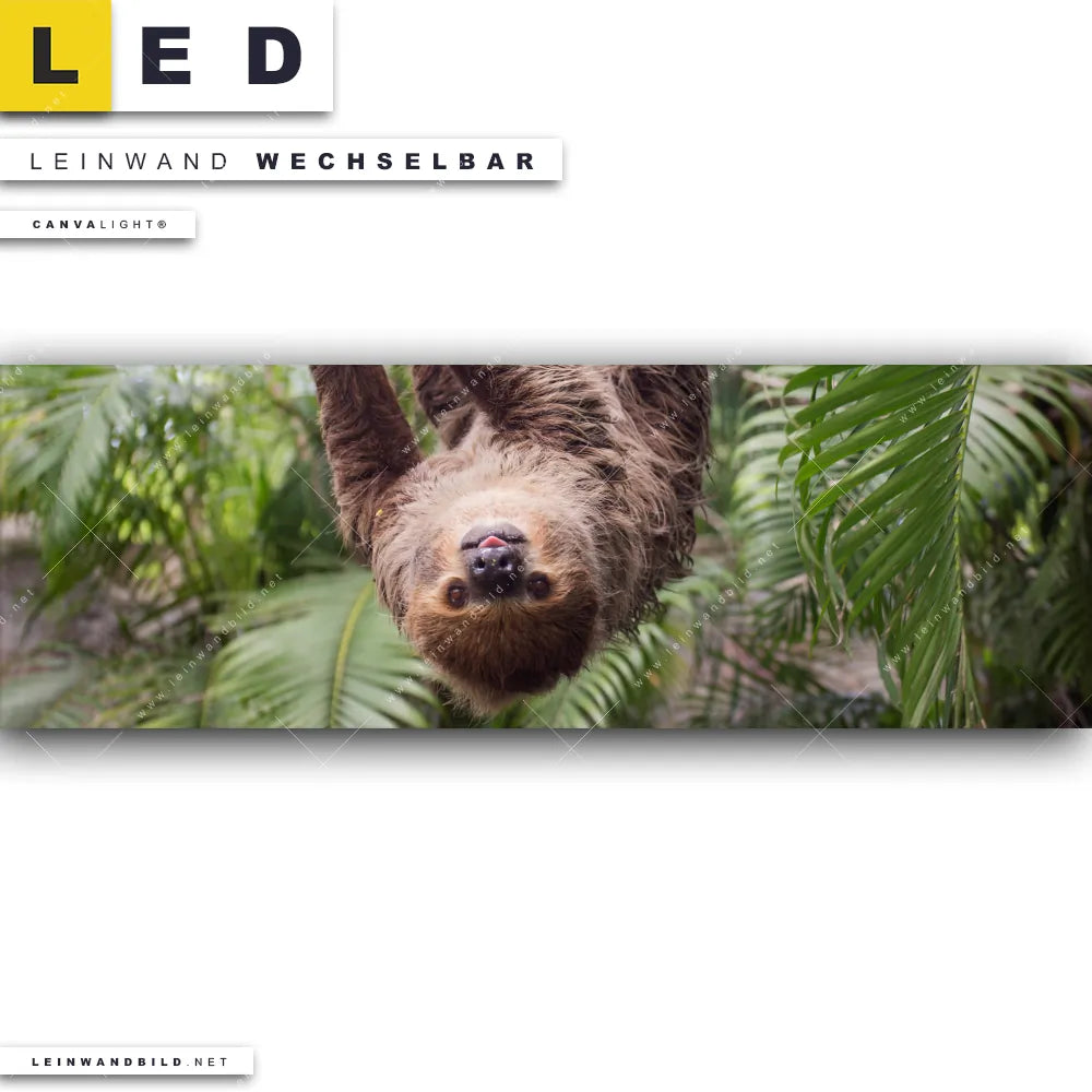 Du bist auf der Suche nach einem Tierwelt, Wald - Bäume LED Leinwandbild im Panorama-Format? Begriffe wie Faultier, Dschungel, Wildtiere, abhängen haben Dich auf der Suche nach Deinem neuen XXL LED Wandbild mit wechselbarer Leinwand inspiriert? Farben wie Braun, Grün dürfen auf Deinem neuen extra breiten Leinwand-LED-Bild nicht fehlen und Leuchtbilder im Natürlich - Realistisch Stil passen perfekt zu Deinem Einrichtungsstil?