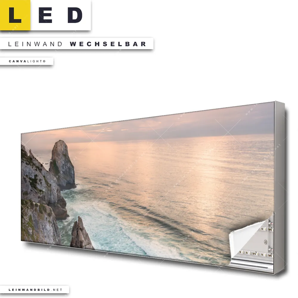Du bist auf der Suche nach einem Landschaften, Strand - Meer LED Leinwandbild im Panorama-Format? Begriffe wie Meer, Küste, Sonnenuntergang, Stein, Natur, Felsen, Sommer, Herbst haben Dich auf der Suche nach Deinem neuen XXL LED Wandbild mit wechselbarer Leinwand inspiriert? Farben wie Beige, Rosa, Mint dürfen auf Deinem neuen extra breiten Leinwand-LED-Bild nicht fehlen und Leuchtbilder im Natürlich - Realistisch, Modern Art Stil passen perfekt zu Deinem Einrichtungsstil?