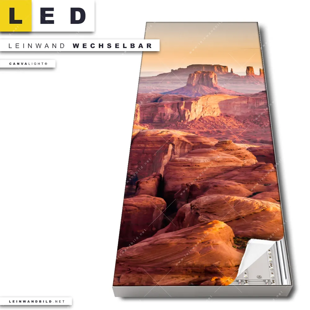 Dann sollte das LED Leinwandbild Canvalight® TEX | Felsen bei Sonnenuntergang | Schmal den Weg zu Dir finden. Das stufenlos dimmbare Leinwandbild Felsplateau im Navajo Tribal Park im steckerfertigen Leuchtrahmen mit Fernbedienung und optionaler Farbtemperatursteuerung fügt sich als Eye-Catcher harmonisch in jedes Arzt - Praxis, Bar - Gastronomie, Büro - Kanzlei, Flur - Eingangsbereich, Wohnzimmer - Schlafzimmer Raumkonzept ein.