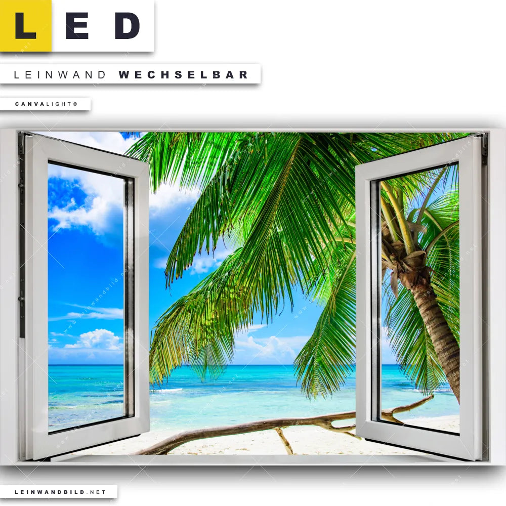 LED Leinwandbild Canvalight® TEX | Fensterblick Karibik Palme | Querformat