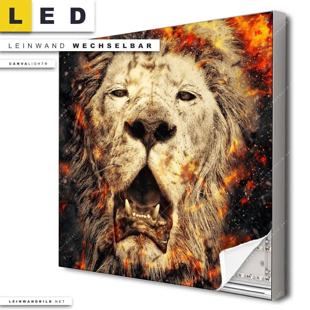 Du bist auf der Suche nach einem Tierwelt LED Leinwandbild im Quadratischen Format? Begriffe wie Raubkatze, Löwe, Afrika, Dschungel, wild, Safari, Lion, Feuer, Flammen, Porträt haben Dich auf der Suche nach Deinem neuen XXL LED Wandbild mit wechselbarer Leinwand inspiriert? Farben wie Schwarz, Beige, Rot, Orange dürfen auf Deinem neuen Leinwand-LED-Bild nicht fehlen und Leuchtbilder im Mixed Media, Modern Art Stil passen perfekt zu Deinem Einrichtungsstil?