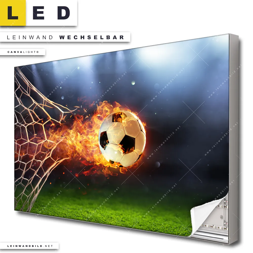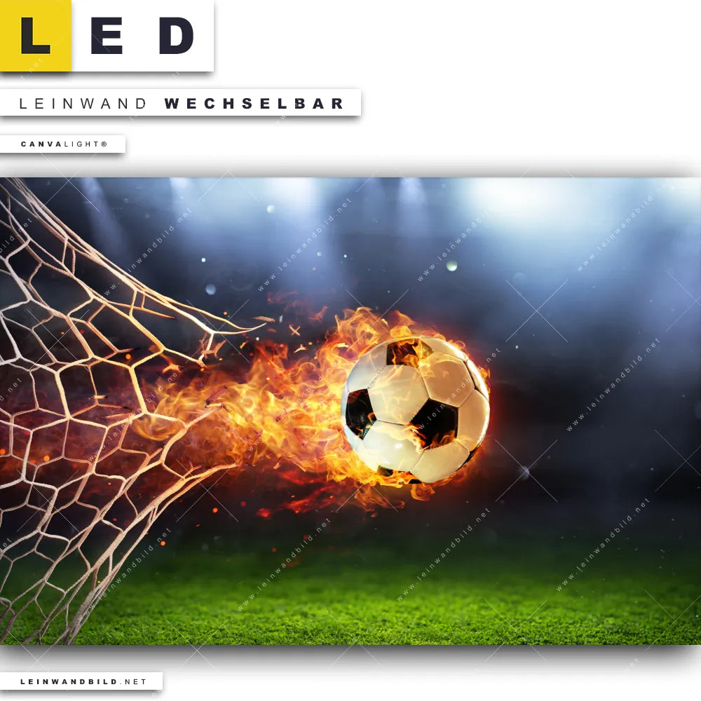 Du bist auf der Suche nach einem Sport - Freizeit LED Leinwandbild im Querformat? Begriffe wie Sport, Fussball, Tor, Spielfeld, Ball, Torschuss, Netz, Meiserschaft, Feuer, Flammen, brennend haben Dich auf der Suche nach Deinem neuen XXL LED Wandbild mit wechselbarer Leinwand inspiriert? Farben wie Grün, Blau, Orange, Weiss, Schwarz dürfen auf Deinem neuen breiten Leinwand-LED-Bild nicht fehlen und Leuchtbilder im Modern Art, Natürlich - Realistisch Stil passen perfekt zu Deinem Einrichtungsstil?