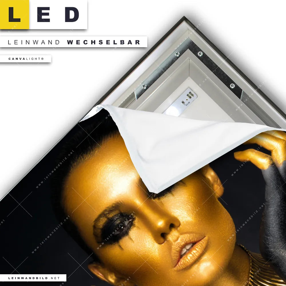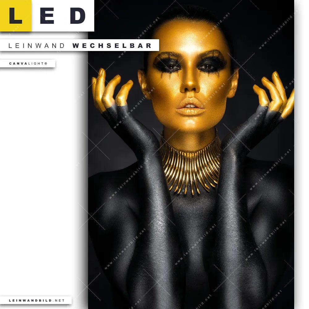 Du bist auf der Suche nach einem Porträts - Menschen LED Leinwandbild im Hochformat? Begriffe wie Frau, Beauty, Gesicht, Körper, Lippen, Mund, Make-up haben Dich auf der Suche nach Deinem neuen XXL LED Wandbild mit wechselbarer Leinwand inspiriert? Farben wie Gold, Schwarz dürfen auf Deinem neuen Leinwand-LED-Bild nicht fehlen und Leuchtbilder im Modern Art Stil passen perfekt zu Deinem Einrichtungsstil?