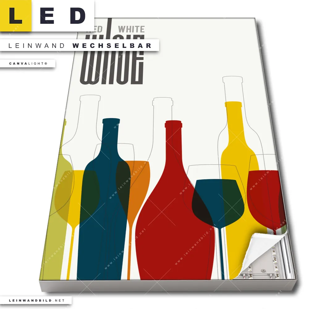 Dann sollte das LED Leinwandbild Canvalight® TEX | Flaschen & Gläser | Hochformat den Weg zu Dir finden. Das stufenlos dimmbare Leinwandbild Illustration Weinflaschen und Gläser im steckerfertigen Leuchtrahmen mit Fernbedienung und optionaler Farbtemperatursteuerung fügt sich als Eye-Catcher harmonisch in jedes Küche - Esszimmer, Büro - Kanzlei, Bar - Gastronomie Raumkonzept ein.