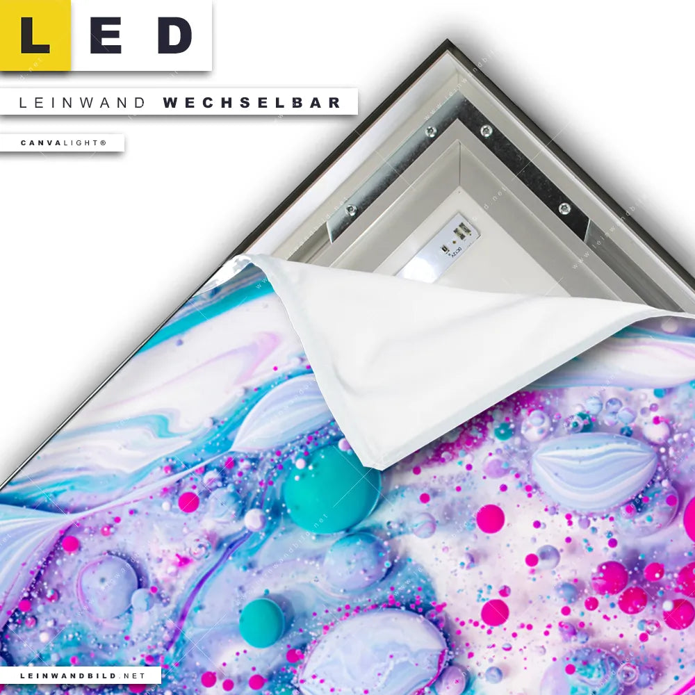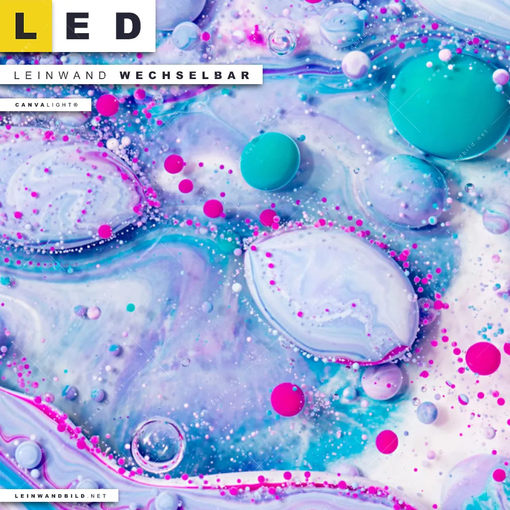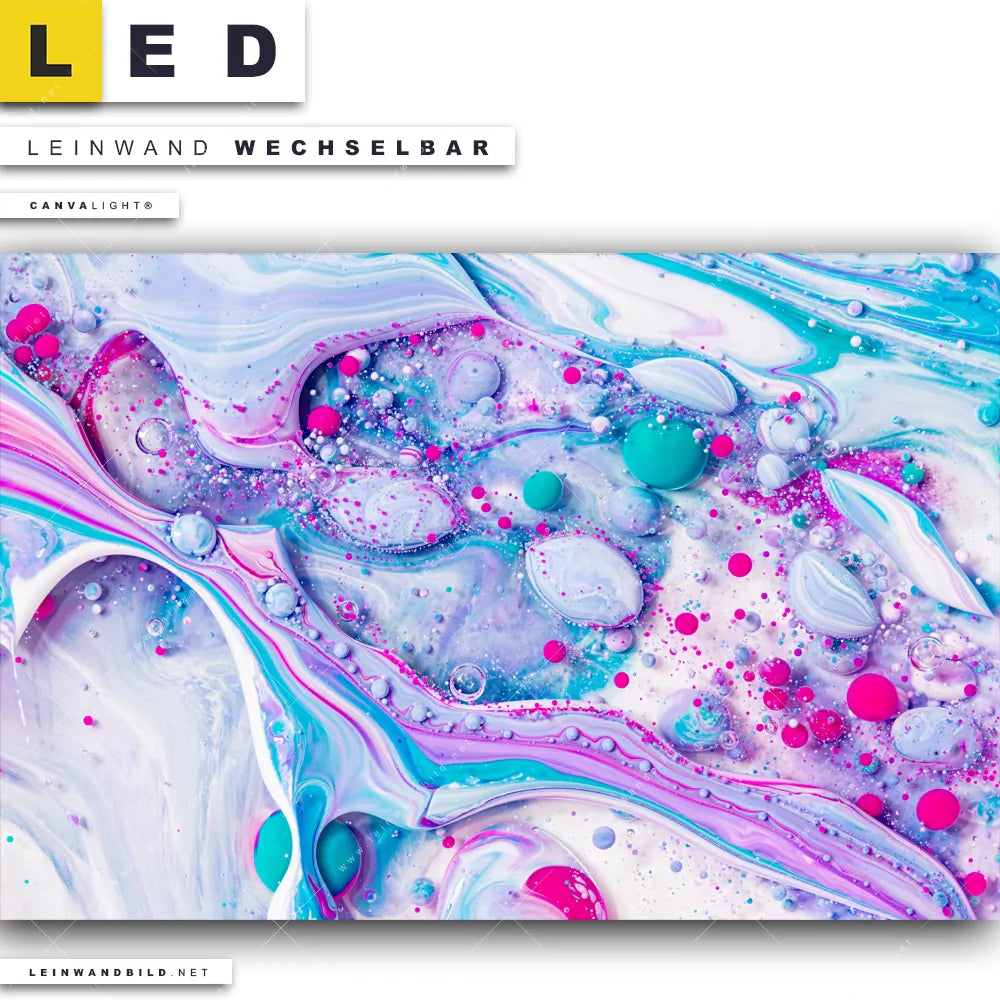 Du bist auf der Suche nach einem Muster - Texturen LED Leinwandbild im Querformat? Begriffe wie Flüssigkeit, Acryl, flüssig, Farbe, Tropfen, Blasen, Kunst, Tinte, Fluid Art haben Dich auf der Suche nach Deinem neuen XXL LED Wandbild mit wechselbarer Leinwand inspiriert? Farben wie Weiss, Pink, Lila, Türkis, Hellblau, Rosa dürfen auf Deinem neuen breiten Leinwand-LED-Bild nicht fehlen und Leuchtbilder im Abstrakt, Modern Art Stil passen perfekt zu Deinem Einrichtungsstil?