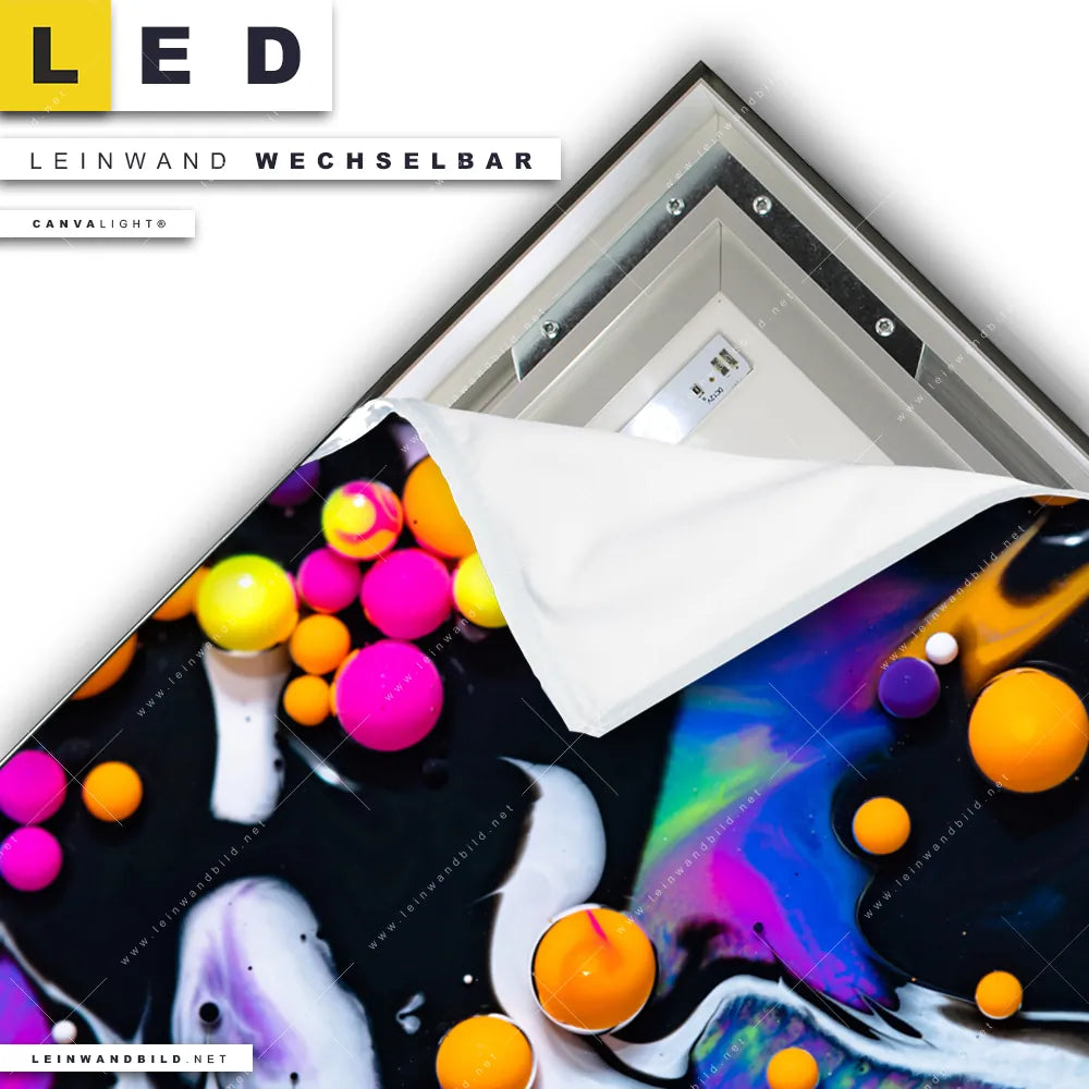 Begriffe wie Flüssigkeit, Acryl, flüssig, Farbe, Tropfen, Blasen, Kunst, Tinte, Fluid Art haben Dich auf der Suche nach Deinem neuen LED Wandbild mit beleuchteter Leinwand inspiriert? Dann sollte das LED Bild Bunte Kugeln mit austauschbarer Textil-Fotoleinwand den Weg zu Dir finden.