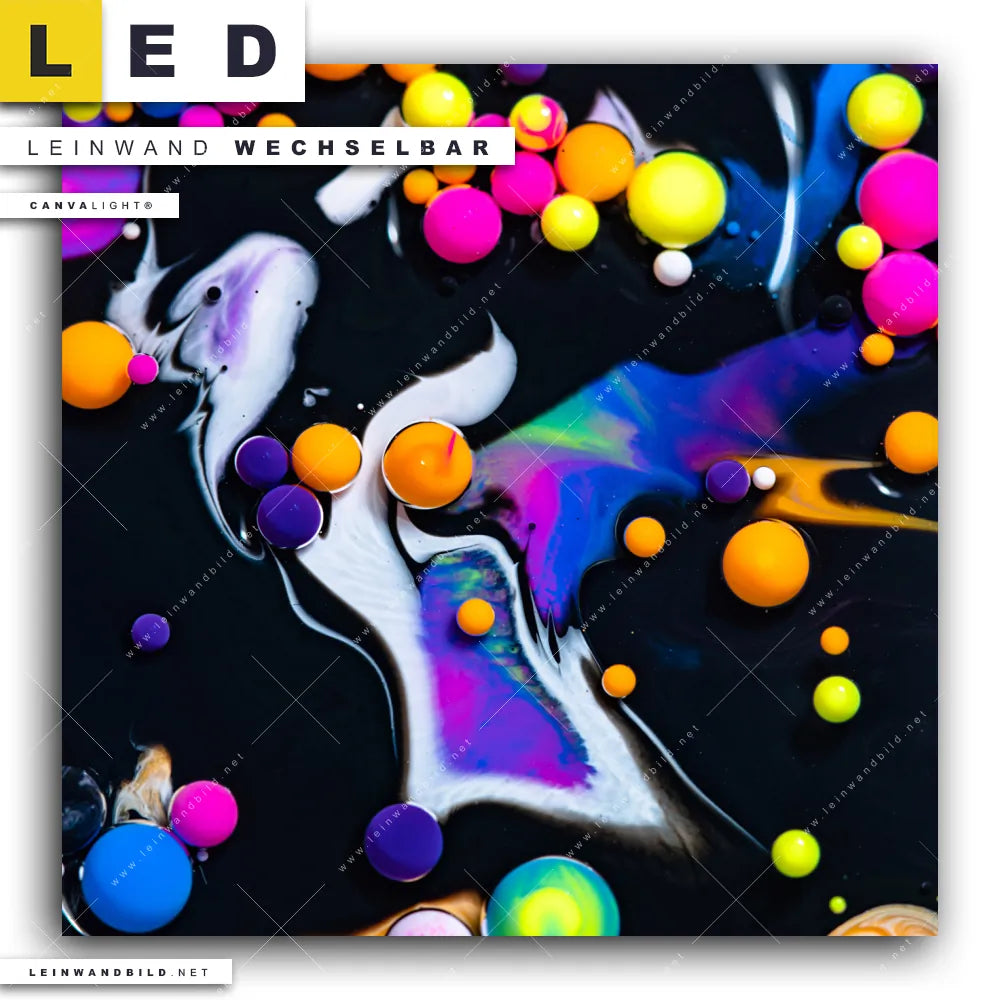 Bitte beachte, dass die Farben, der auf dem Monitor abgebildeten Neon-Blasen in Fluid Art Darstellung, möglicherweise von den Originalfarben deines LED Leinwandbildes abweichen können.