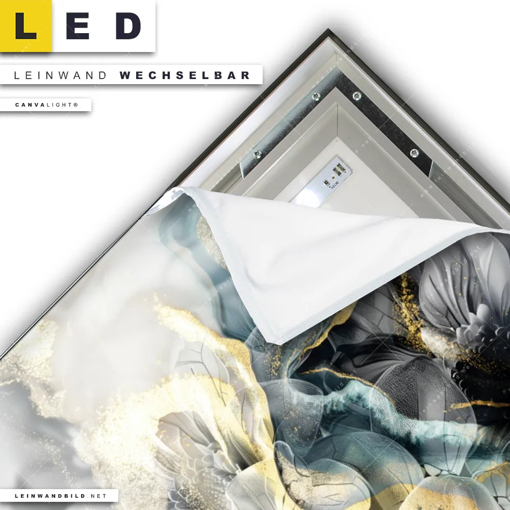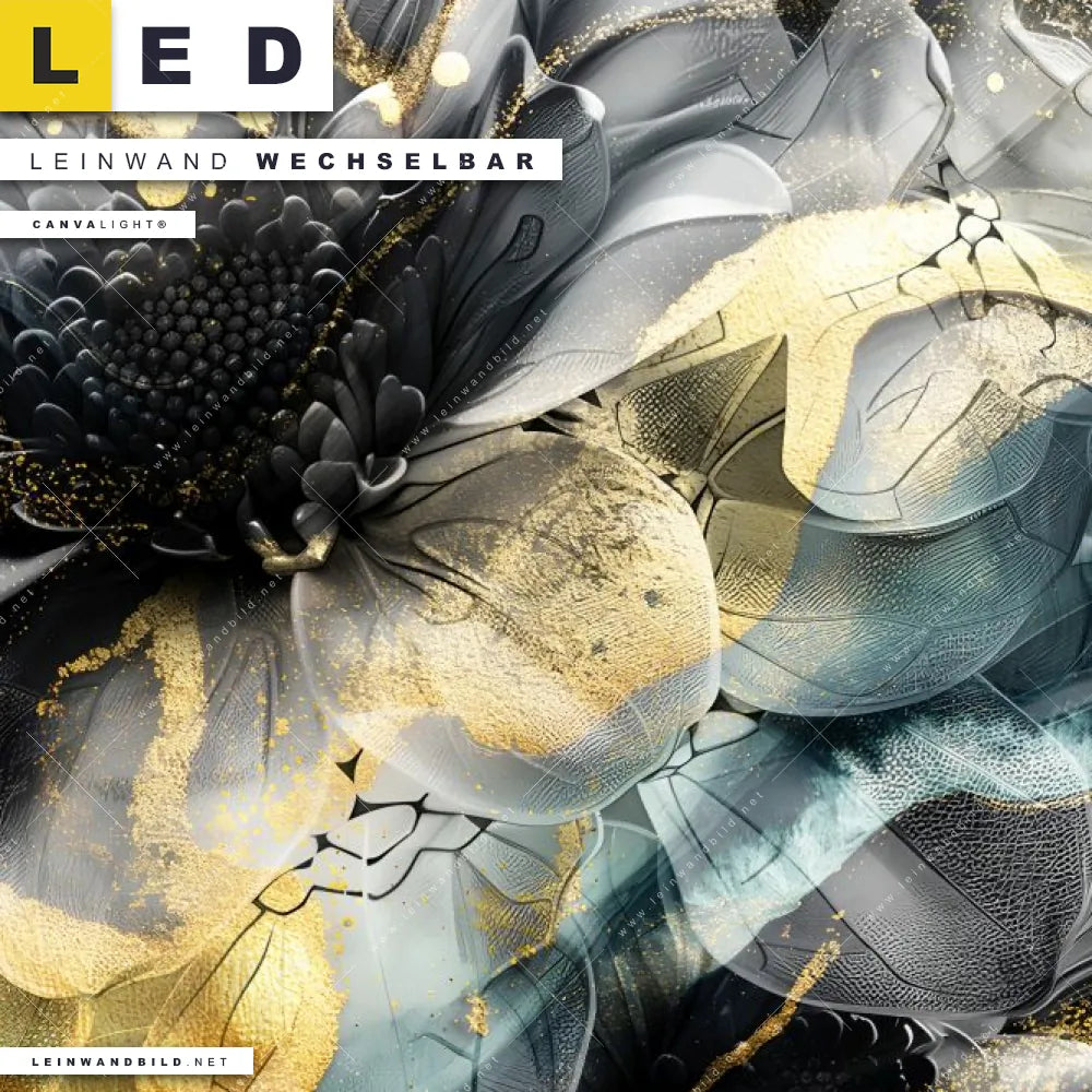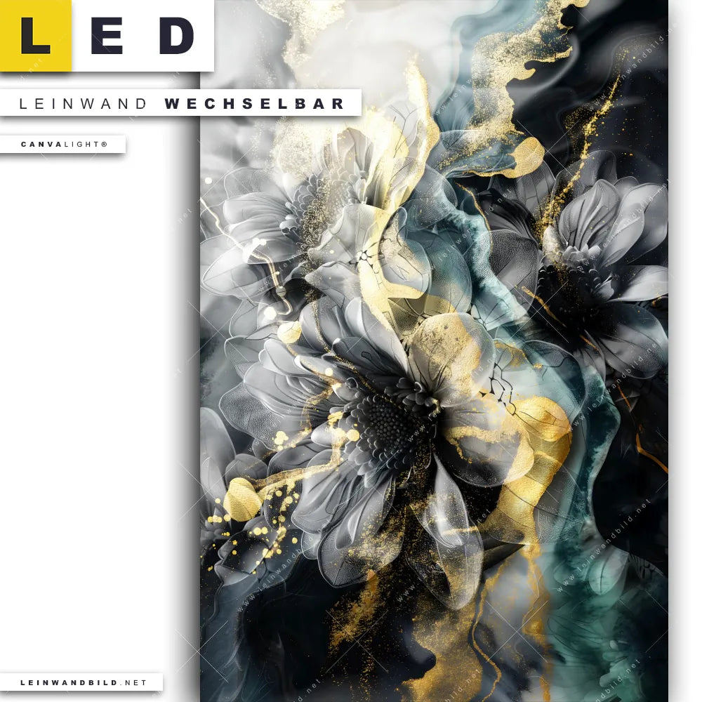 Du bist auf der Suche nach einem Blumen - Botanik, Muster - Texturen LED Leinwandbild im Hochformat? Begriffe wie Blumen, Pflanze, Natur, Blüten, Glitzer, Farbspritzer, Fluid Art haben Dich auf der Suche nach Deinem neuen XXL LED Wandbild mit wechselbarer Leinwand inspiriert? Farben wie Schwarz, Grau , Gold, Türkis dürfen auf Deinem neuen Leinwand-LED-Bild nicht fehlen und Leuchtbilder im Abstrakt, Floral, Modern Art Stil passen perfekt zu Deinem Einrichtungsstil?
