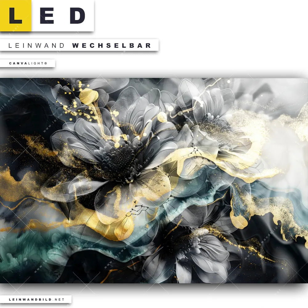 Du bist auf der Suche nach einem Blumen - Botanik, Muster - Texturen LED Leinwandbild im Querformat? Begriffe wie Blumen, Pflanze, Natur, Blüten, Glitzer, Farbspritzer, Fluid Art haben Dich auf der Suche nach Deinem neuen XXL LED Wandbild mit wechselbarer Leinwand inspiriert? Farben wie Schwarz, Grau , Gold, Türkis dürfen auf Deinem neuen breiten Leinwand-LED-Bild nicht fehlen und Leuchtbilder im Abstrakt, Floral, Modern Art Stil passen perfekt zu Deinem Einrichtungsstil?
