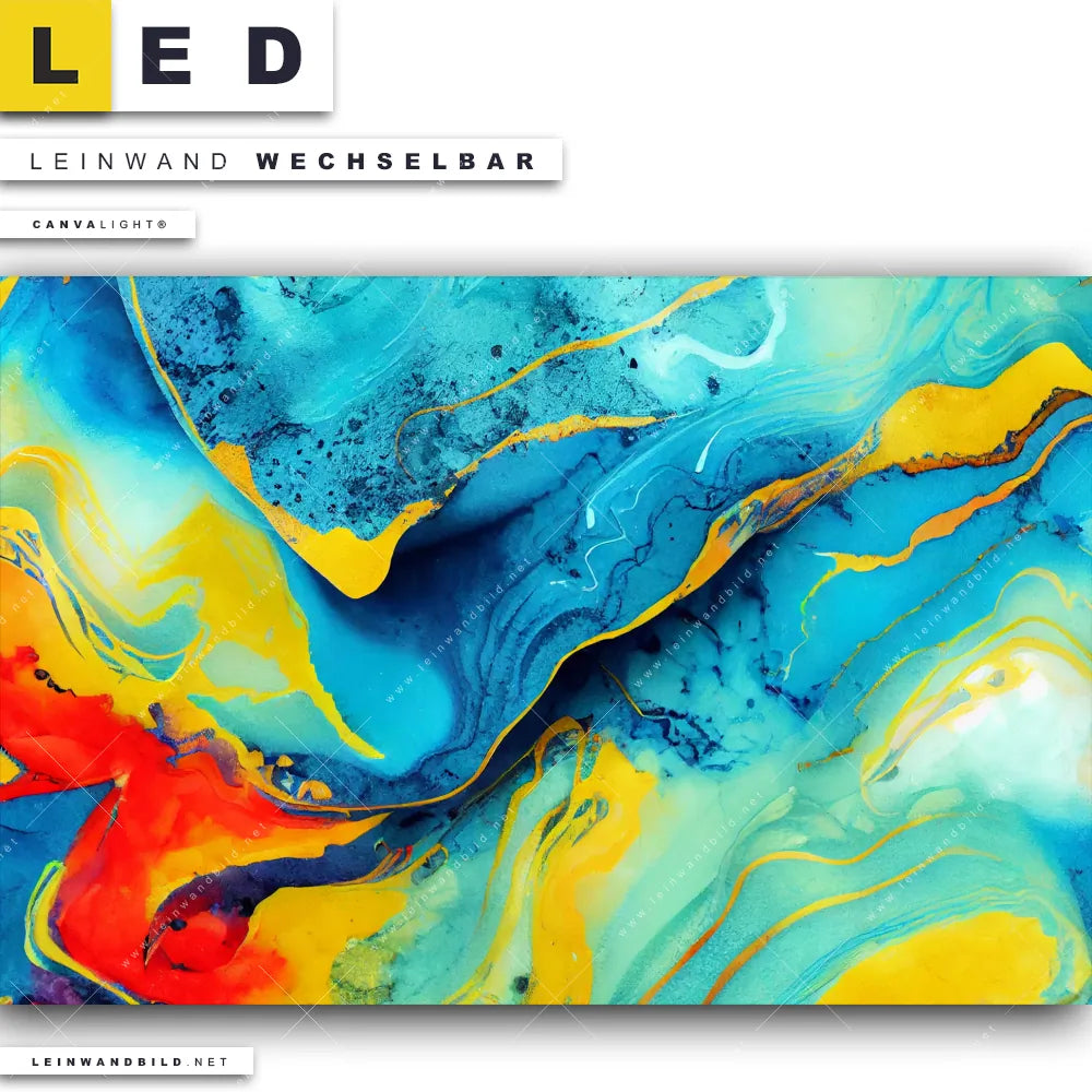 Du bist auf der Suche nach einem Muster - Texturen LED Leinwandbild im Querformat? Begriffe wie Flüssigkeit, Acryl, flüssig, Farbe, Marmorierung, Tinte, Alkohol, Fluid Art haben Dich auf der Suche nach Deinem neuen XXL LED Wandbild mit wechselbarer Leinwand inspiriert? Farben wie Blau, Türkis, Gelb , Rot dürfen auf Deinem neuen breiten Leinwand-LED-Bild nicht fehlen und Leuchtbilder im Abstrakt, Modern Art Stil passen perfekt zu Deinem Einrichtungsstil?