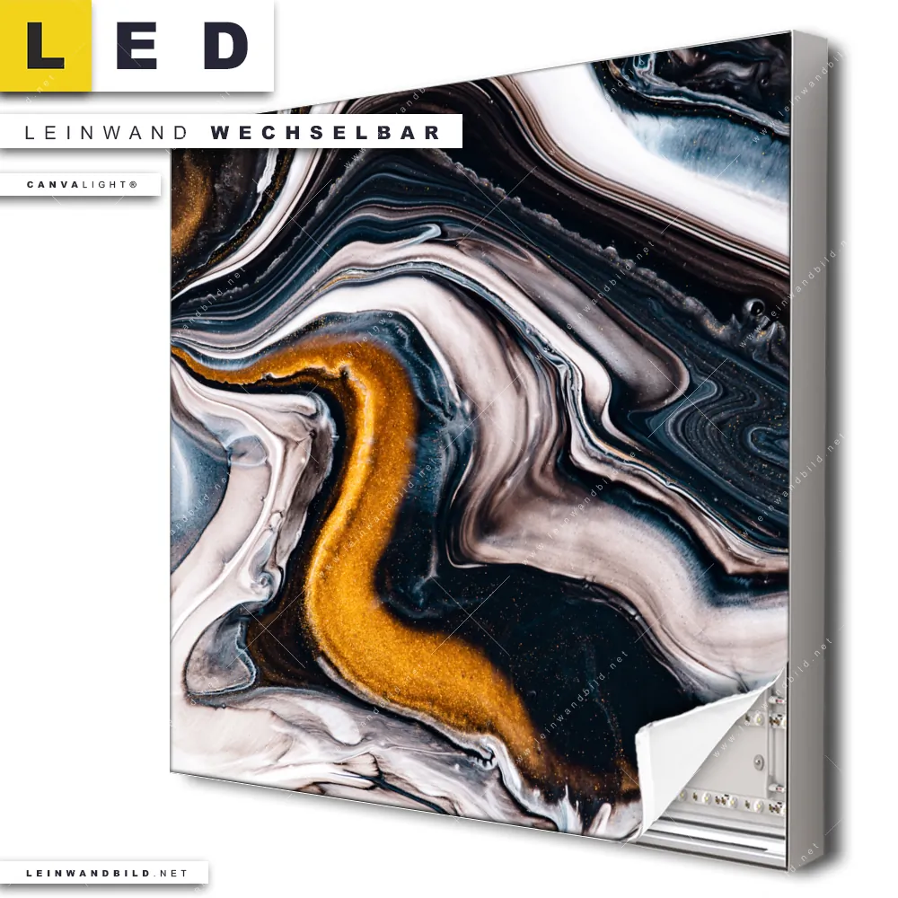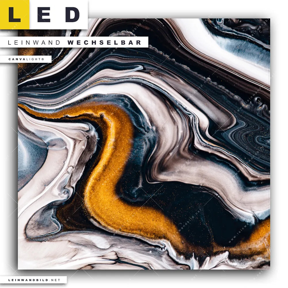 Du bist auf der Suche nach einem Muster - Texturen LED Leinwandbild im Quadratischen Format? Begriffe wie Flüssigkeit, Acryl, flüssig, Farbe, Marmorierung, Tinte, Alkohol, Goldader, Fluid Art haben Dich auf der Suche nach Deinem neuen XXL LED Wandbild mit wechselbarer Leinwand inspiriert? Farben wie Gold, Weiss, Schwarz, Blau dürfen auf Deinem neuen Leinwand-LED-Bild nicht fehlen und Leuchtbilder im Abstrakt, Modern Art Stil passen perfekt zu Deinem Einrichtungsstil?