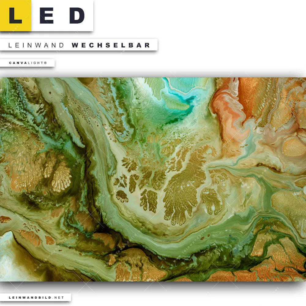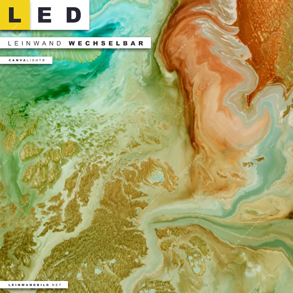 Du bist auf der Suche nach einem Muster - Texturen LED Leinwandbild im Querformat? Begriffe wie Flüssigkeit, Acryl, flüssig, Farbe, Marmorierung, Tinte, Alkohol, Landschaft, Natur, Wald, Fluid Art haben Dich auf der Suche nach Deinem neuen XXL LED Wandbild mit wechselbarer Leinwand inspiriert? Farben wie Hellgrün, Grün, Beige, Türkis dürfen auf Deinem neuen breiten Leinwand-LED-Bild nicht fehlen und Leuchtbilder im Abstrakt, Modern Art Stil passen perfekt zu Deinem Einrichtungsstil?