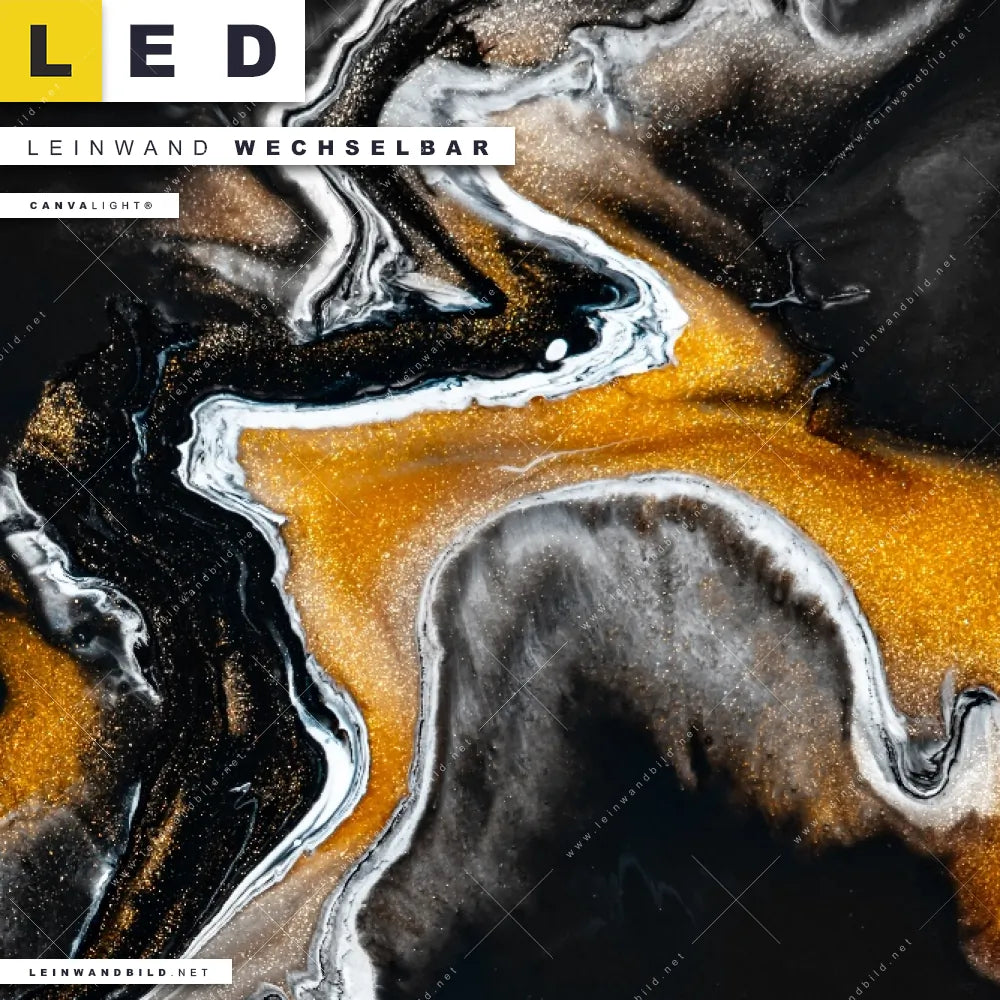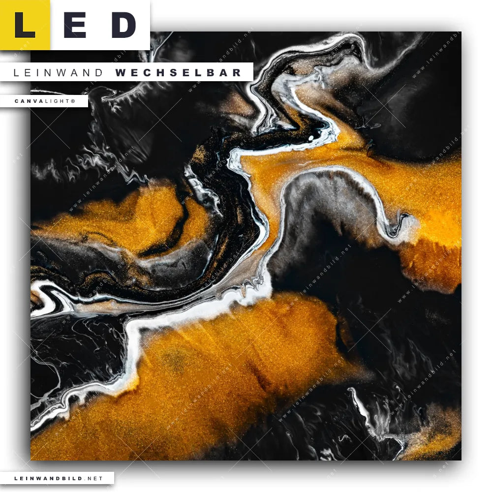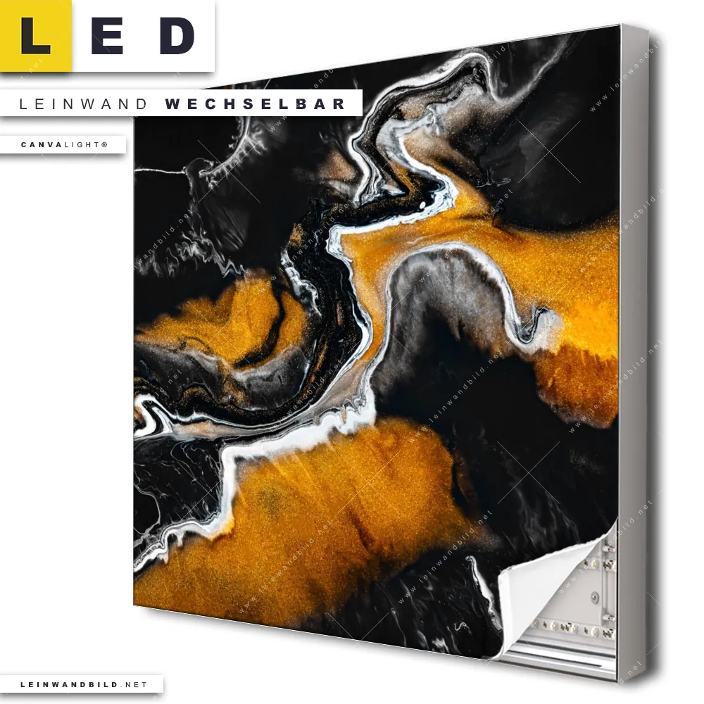 Du bist auf der Suche nach einem Muster - Texturen LED Leinwandbild im Quadratischen Format? Begriffe wie Flüssigkeit, Acryl, flüssig, Farbe, Marmorierung, Tinte, Alkohol, Fluid Art haben Dich auf der Suche nach Deinem neuen XXL LED Wandbild mit wechselbarer Leinwand inspiriert? Farben wie Schwarz, Orange, Gold dürfen auf Deinem neuen Leinwand-LED-Bild nicht fehlen und Leuchtbilder im Abstrakt, Modern Art Stil passen perfekt zu Deinem Einrichtungsstil?