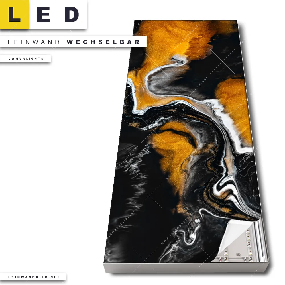 Du bist auf der Suche nach einem Muster - Texturen LED Leinwandbild im Schmalen Format? Begriffe wie Flüssigkeit, Acryl, flüssig, Farbe, Marmorierung, Tinte, Alkohol, Fluid Art haben Dich auf der Suche nach Deinem neuen XXL LED Wandbild mit wechselbarer Leinwand inspiriert? Farben wie Schwarz, Orange, Gold dürfen auf Deinem neuen Leinwand-LED-Bild im Panorama-Hochformat nicht fehlen und Leuchtbilder im Abstrakt, Modern Art Stil passen perfekt zu Deinem Einrichtungsstil?