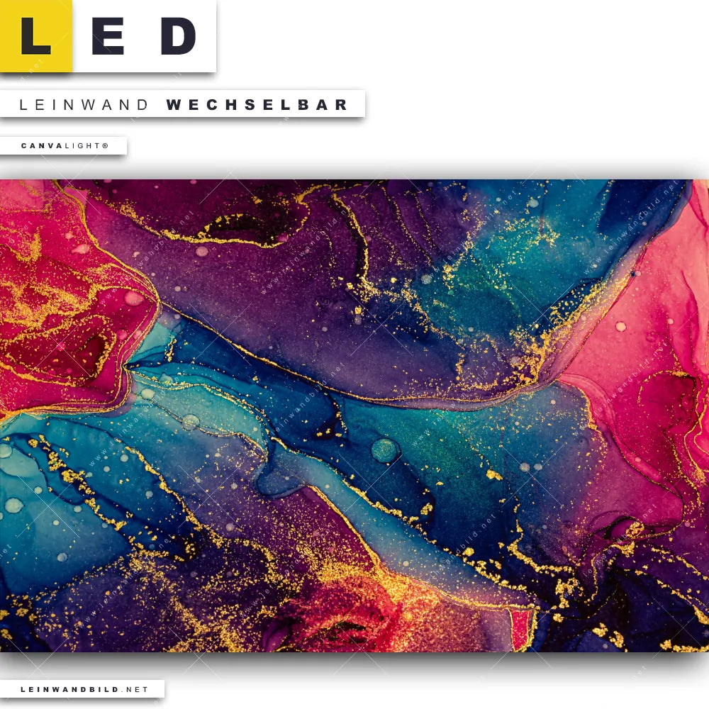 Du bist auf der Suche nach einem Muster - Texturen LED Leinwandbild im Querformat? Begriffe wie Marmor, Flüssigkeit, Acryl, flüssig, Farbe, Marmorierung, Tinte, Fluid Art haben Dich auf der Suche nach Deinem neuen XXL LED Wandbild mit wechselbarer Leinwand inspiriert? Farben wie Lila, Blau, Gold, Rot, Türkis, Orange dürfen auf Deinem neuen breiten Leinwand-LED-Bild nicht fehlen und Leuchtbilder im Abstrakt, Modern Art Stil passen perfekt zu Deinem Einrichtungsstil?