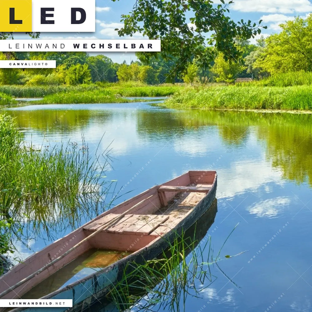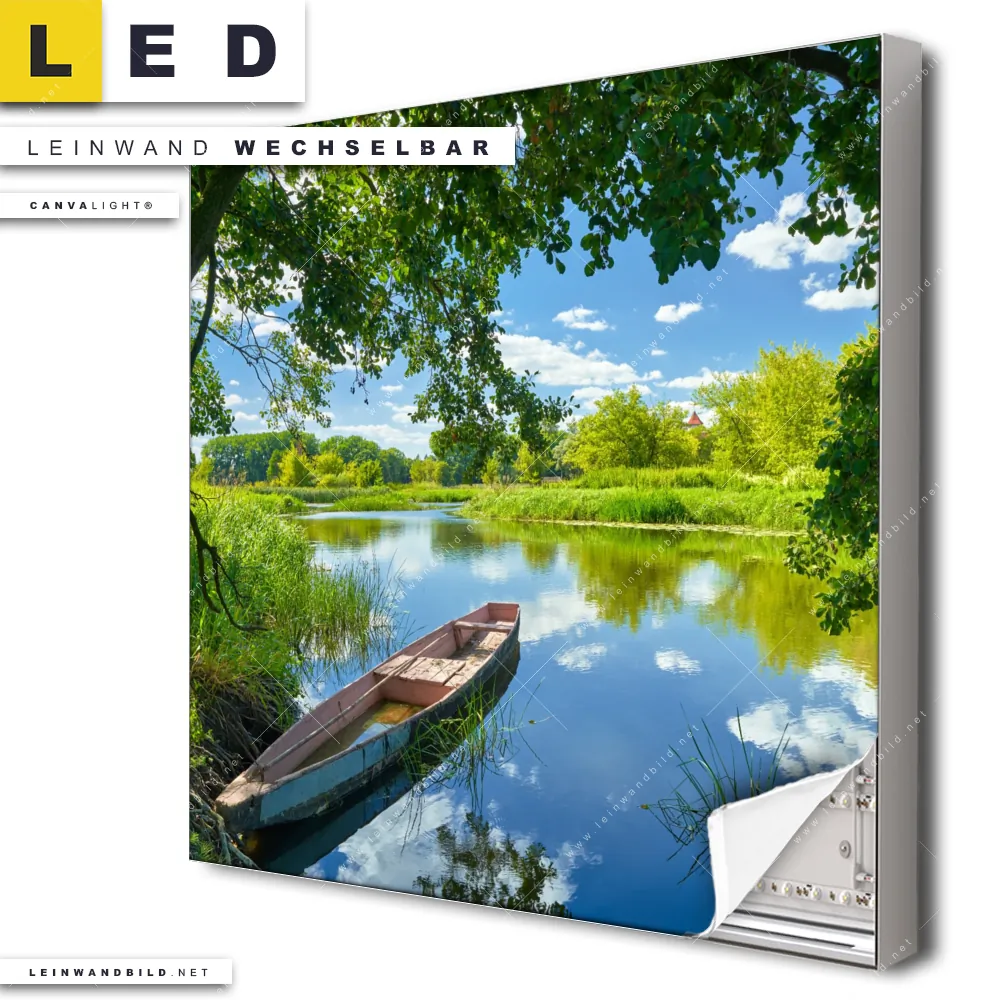 Du bist auf der Suche nach einem Landschaften LED Leinwandbild im Quadratischen Format? Begriffe wie Urlaub, Reisen, Wasser, Wasserspiegelung, Boot, Bäume, Fluss, See, Wald haben Dich auf der Suche nach Deinem neuen XXL LED Wandbild mit wechselbarer Leinwand inspiriert? Farben wie Blau, Hellgrün, Hellblau, Grün dürfen auf Deinem neuen Leinwand-LED-Bild nicht fehlen und Leuchtbilder im Natürlich - Realistisch Stil passen perfekt zu Deinem Einrichtungsstil?