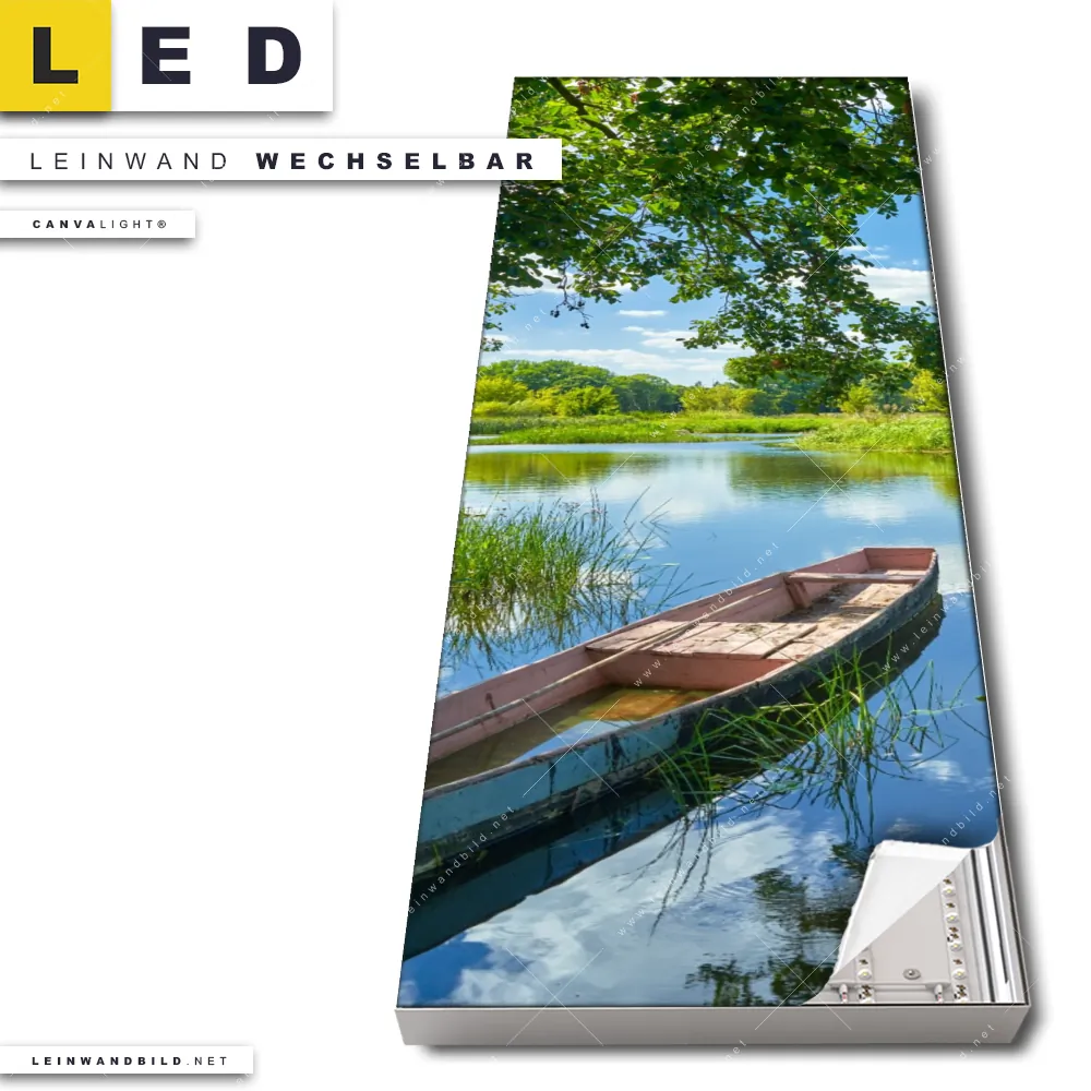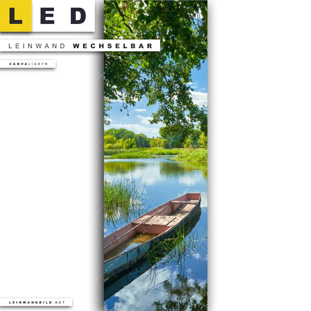 Du bist auf der Suche nach einem Landschaften LED Leinwandbild im Schmalen Format? Begriffe wie Urlaub, Reisen, Wasser, Wasserspiegelung, Boot, Bäume, Fluss, See, Wald haben Dich auf der Suche nach Deinem neuen XXL LED Wandbild mit wechselbarer Leinwand inspiriert? Farben wie Blau, Hellgrün, Hellblau, Grün dürfen auf Deinem neuen Leinwand-LED-Bild im Panorama-Hochformat nicht fehlen und Leuchtbilder im Natürlich - Realistisch Stil passen perfekt zu Deinem Einrichtungsstil?