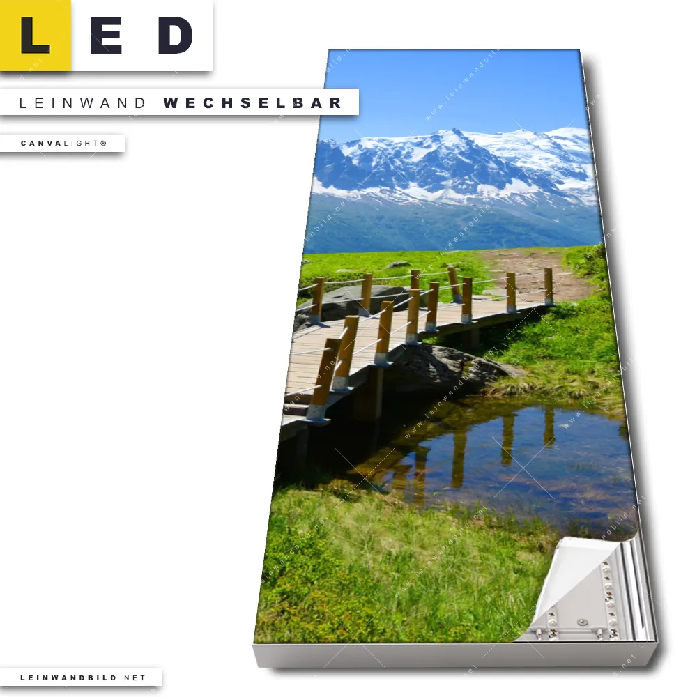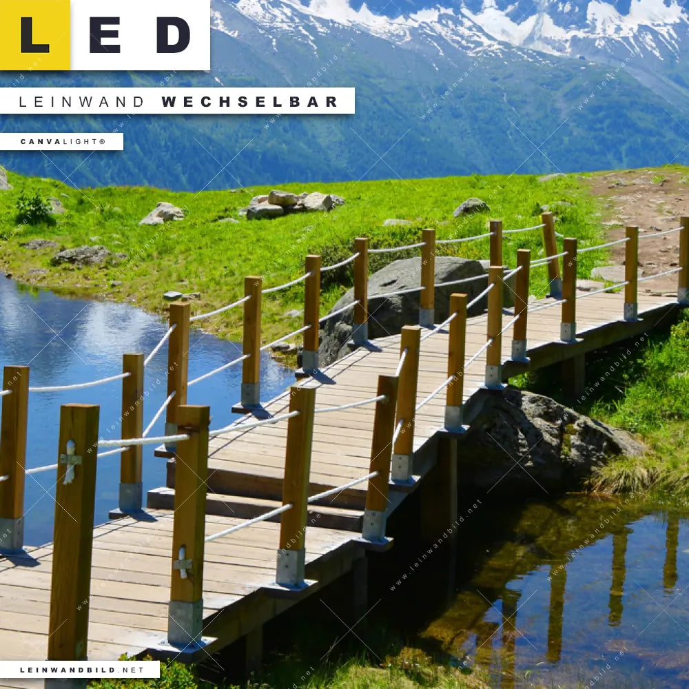 Du bist auf der Suche nach einem Landschaften LED Leinwandbild im Schmalen Format? Begriffe wie Steg, Berge, Bergsee, Gebirge, Wiese, wandern, See, Urlaub, Reisen, Brücke, Natur haben Dich auf der Suche nach Deinem neuen XXL LED Wandbild mit wechselbarer Leinwand inspiriert? Farben wie Grün, Blau, Weiss, Braun, Beige dürfen auf Deinem neuen Leinwand-LED-Bild im Panorama-Hochformat nicht fehlen und Leuchtbilder im Natürlich - Realistisch Stil passen perfekt zu Deinem Einrichtungsstil?