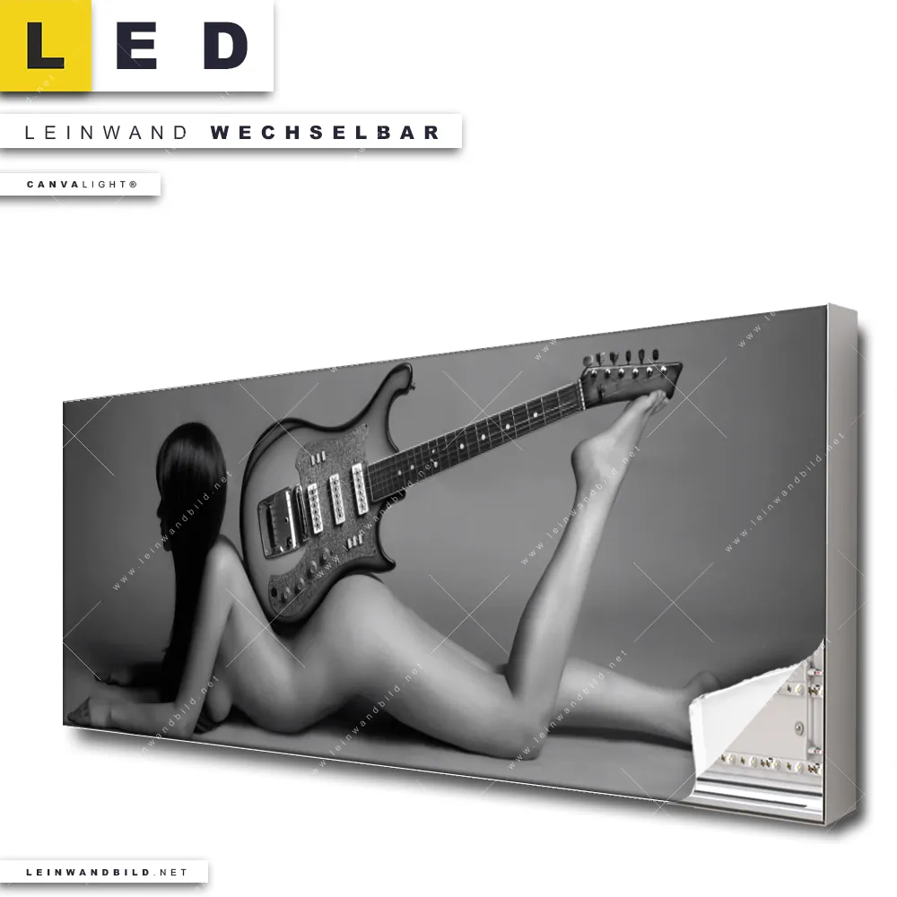 Du bist auf der Suche nach einem Erotik - Akt LED Leinwandbild im Panorama-Format? Begriffe wie Frau, Erotik, modern, Beauty, Körper, Body, Akt, Musik, Gitarre, Instrument haben Dich auf der Suche nach Deinem neuen XXL LED Wandbild mit wechselbarer Leinwand inspiriert? Farben wie Schwarz, Weiss dürfen auf Deinem neuen extra breiten Leinwand-LED-Bild nicht fehlen und Leuchtbilder im Natürlich - Realistisch Stil passen perfekt zu Deinem Einrichtungsstil?