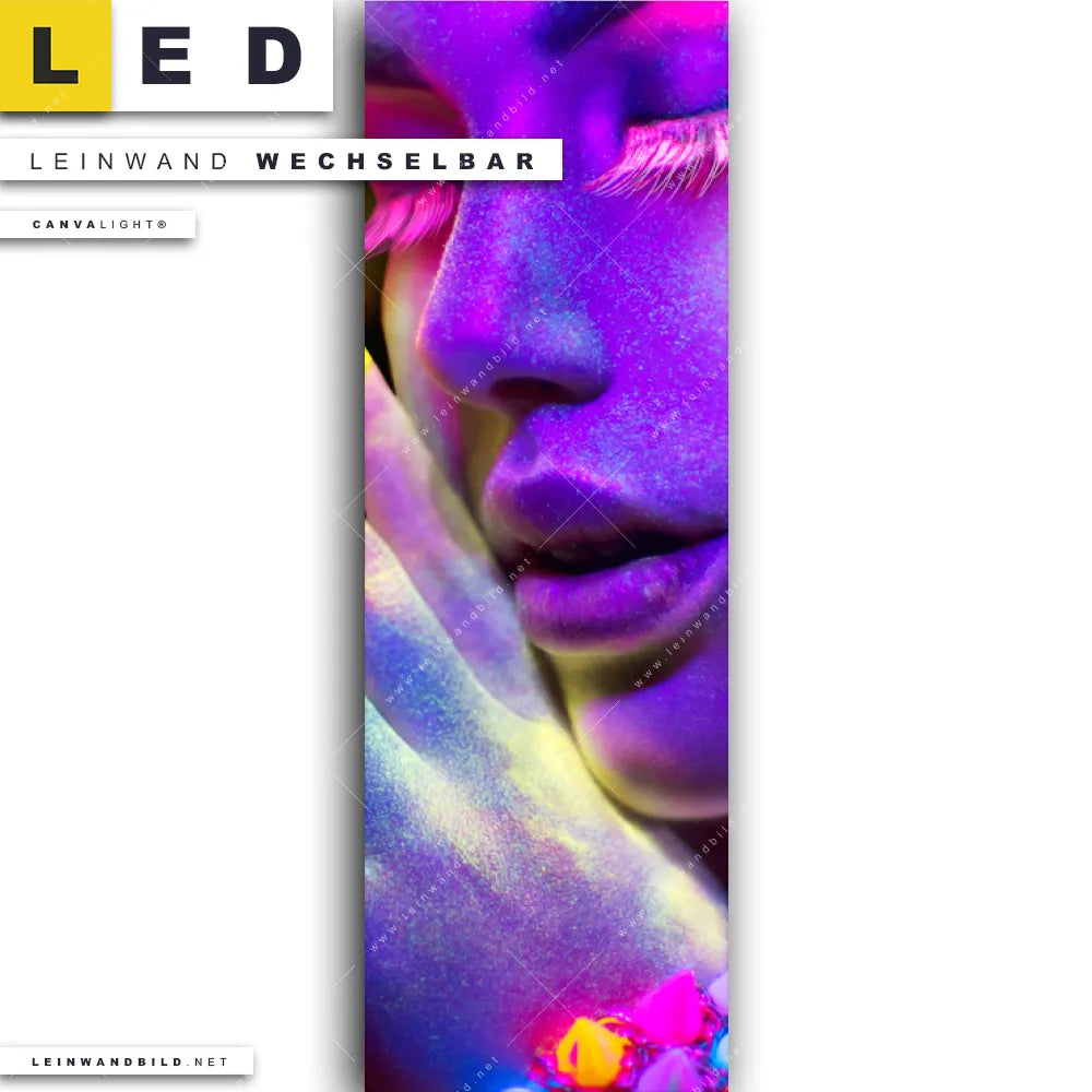 Du bist auf der Suche nach einem Porträts - Menschen LED Leinwandbild im Schmalen Format? Begriffe wie Frau, Porträt, Farbe, Beauty, Gesicht, Körper, Neon, Neonlicht, Make-up haben Dich auf der Suche nach Deinem neuen XXL LED Wandbild mit wechselbarer Leinwand inspiriert? Farben wie Schwarz, Lila, Pink dürfen auf Deinem neuen Leinwand-LED-Bild im Panorama-Hochformat nicht fehlen und Leuchtbilder im Modern Art, Pop Art Stil passen perfekt zu Deinem Einrichtungsstil?