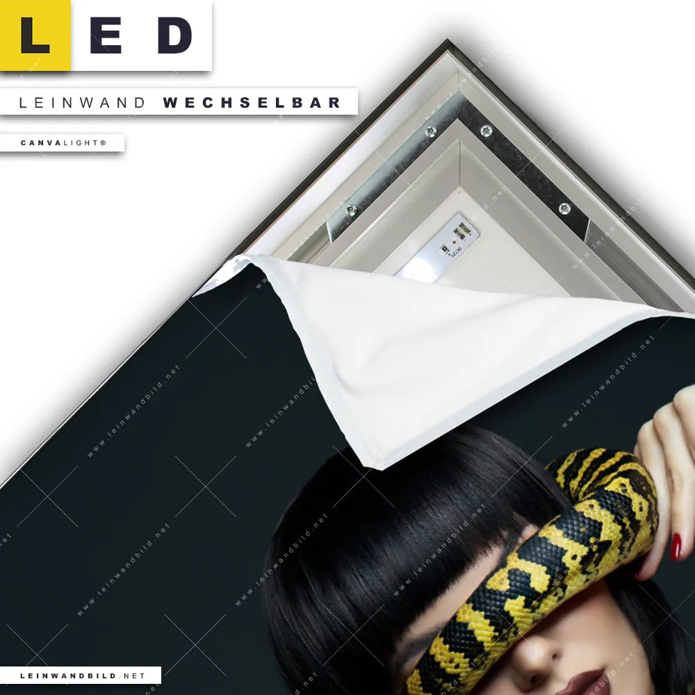 Du konfigurierst Dein individuelles LED Leinwandbild Canvalight® TEX | Frau mit gelber Schlange | Hochformat und wir produzieren es NEU für Dich. Unsere Porträts - Menschen, Tierwelt LED Bilder mit wechselbarer Textil-Leinwand sind KEINE Lagerware. Du bist Dir unsicher, welches Motiv oder Format das richtige für dein individuelles Canvalight® Leuchtbild ist, dann helfen wir dir gerne weiter und beraten dich!