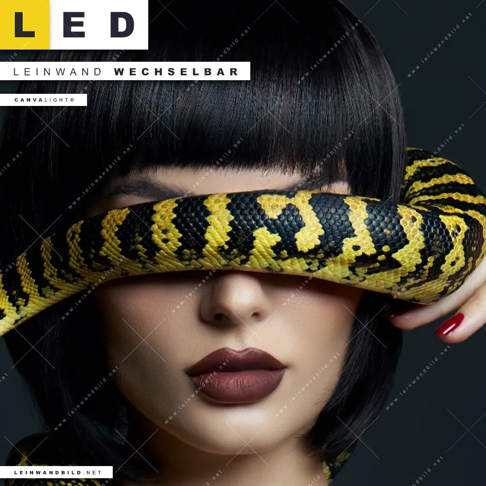 Du konfigurierst Dein individuelles LED Leinwandbild Canvalight® TEX | Frau mit gelber Schlange | Quadrat und wir produzieren es NEU für Dich. Unsere Porträts - Menschen, Tierwelt LED Bilder mit wechselbarer Textil-Leinwand sind KEINE Lagerware. Du bist Dir unsicher, welches Motiv oder Format das richtige für dein individuelles Canvalight® Leuchtbild ist, dann helfen wir dir gerne weiter und beraten dich!