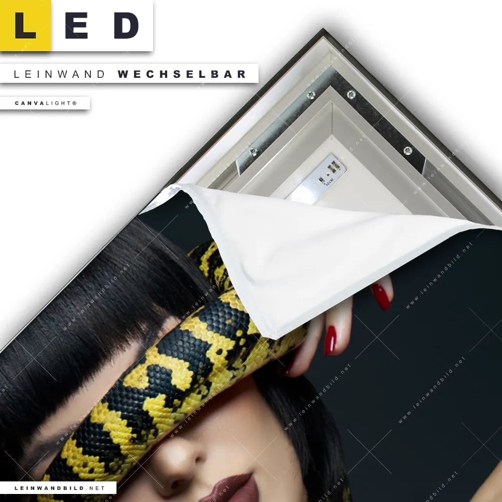 Du konfigurierst Dein individuelles LED Leinwandbild Canvalight® TEX | Frau mit gelber Schlange | Querformat und wir produzieren es NEU für Dich. Unsere Porträts - Menschen, Tierwelt LED Bilder mit wechselbarer Textil-Leinwand sind KEINE Lagerware. Du bist Dir unsicher, welches Motiv oder Format das richtige für dein individuelles Canvalight® Leuchtbild ist, dann helfen wir dir gerne weiter und beraten dich!