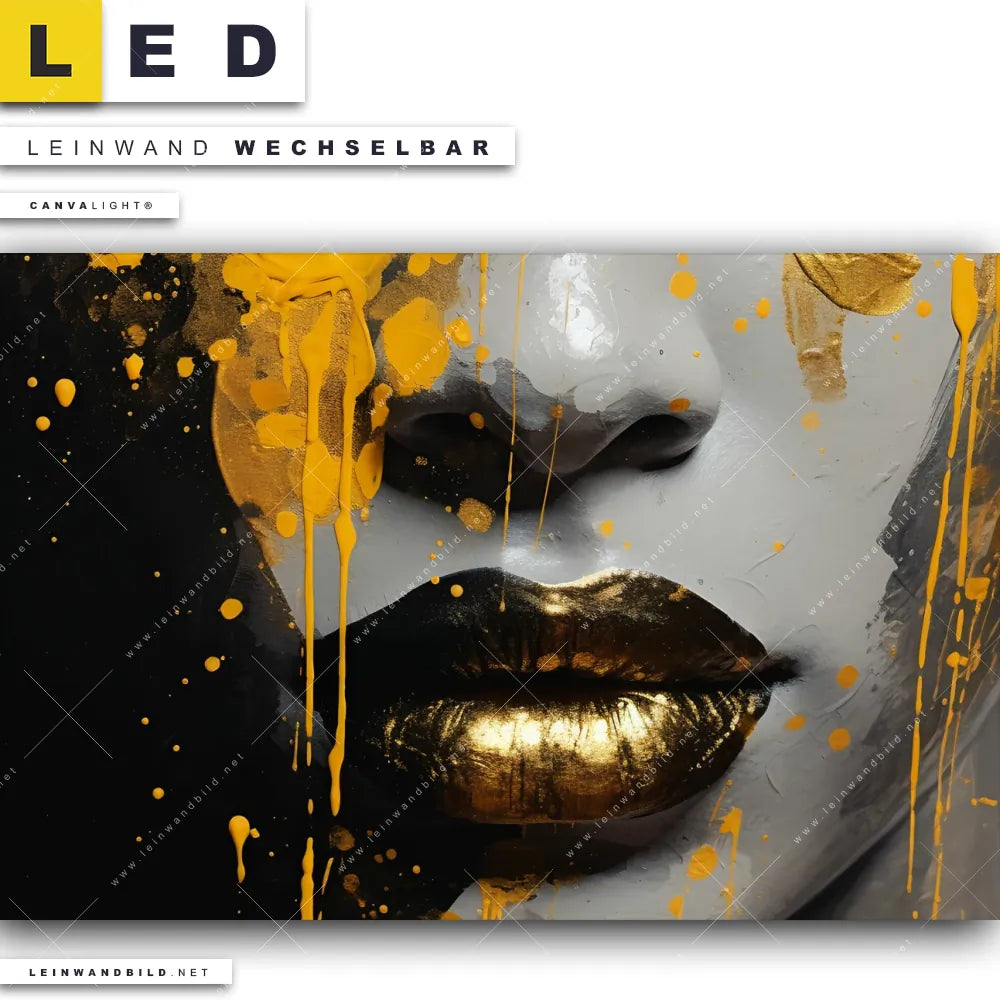 Du bist auf der Suche nach einem Porträts - Menschen LED Leinwandbild im Querformat? Begriffe wie Gesicht, Farbexplosion, Farbspritzer, Frau, Lippen, Beauty haben Dich auf der Suche nach Deinem neuen XXL LED Wandbild mit wechselbarer Leinwand inspiriert? Farben wie Gold, Orange, Schwarz dürfen auf Deinem neuen breiten Leinwand-LED-Bild nicht fehlen und Leuchtbilder im Abstrakt, Modern Art Stil passen perfekt zu Deinem Einrichtungsstil?