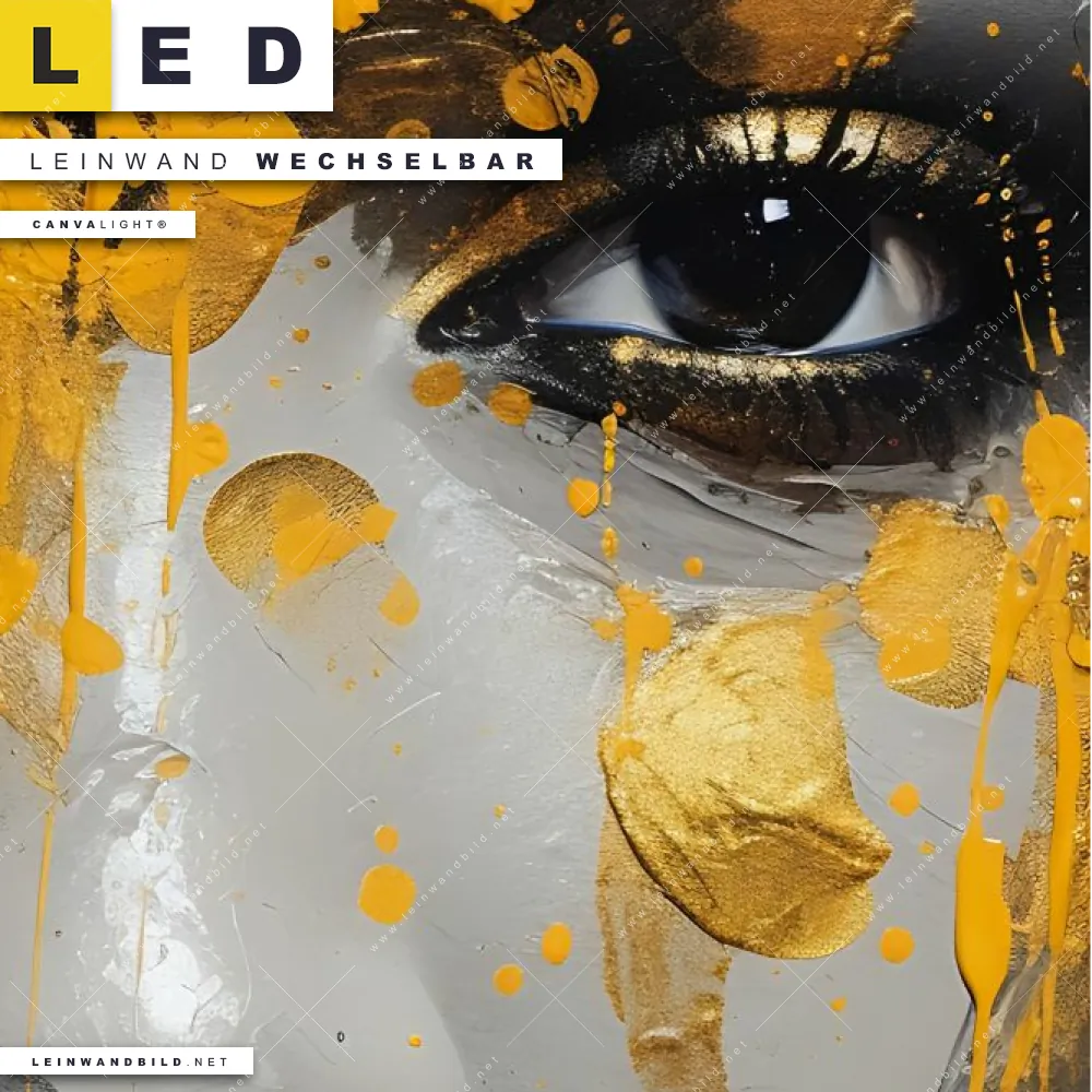 Du konfigurierst Dein individuelles LED Leinwandbild Canvalight® TEX | Frau mit Goldfarbe | Querformat und wir produzieren es NEU für Dich. Unsere Porträts - Menschen LED Bilder mit wechselbarer Textil-Leinwand sind KEINE Lagerware. Du bist Dir unsicher, welches Motiv oder Format das richtige für dein individuelles Canvalight® Leuchtbild ist, dann helfen wir dir gerne weiter und beraten dich!