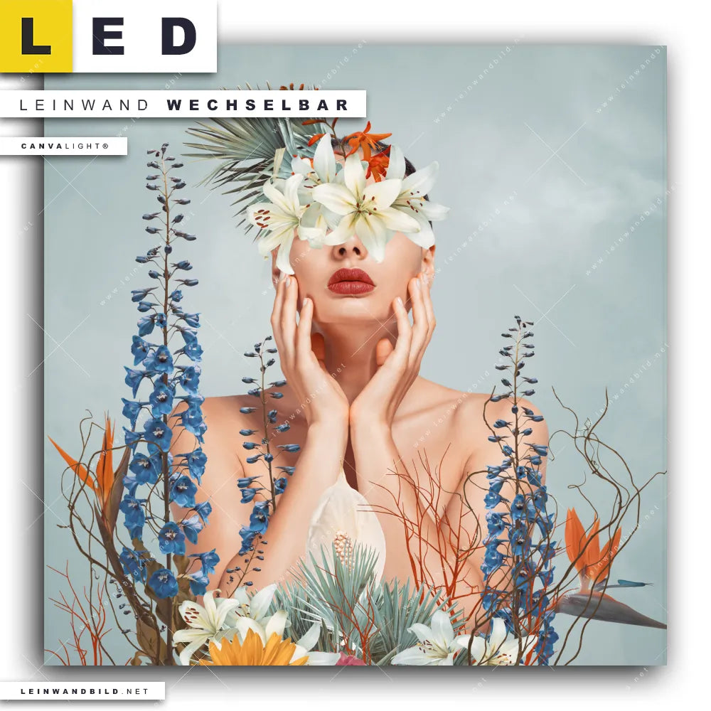 Du bist auf der Suche nach einem Porträts - Menschen, Blumen - Botanik LED Leinwandbild im Quadratischen Format? Begriffe wie Menschen & Blumen, Frau, Porträt, modern, Beauty, Gesicht, Blumen, Blüten, Schönheit, Mode haben Dich auf der Suche nach Deinem neuen XXL LED Wandbild mit wechselbarer Leinwand inspiriert? Farben wie Mint, Beige, Weiss, Blau, Orange dürfen auf Deinem neuen Leinwand-LED-Bild nicht fehlen und Leuchtbilder im Modern Art, Floral Stil passen perfekt zu Deinem Einrichtungsstil?