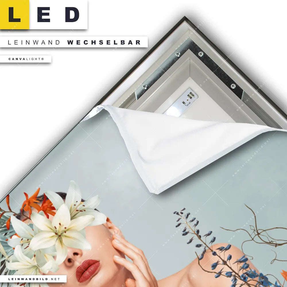 Du konfigurierst Dein individuelles LED Leinwandbild Canvalight® TEX | Frauenportrait mit Blumen | Querformat und wir produzieren es NEU für Dich. Unsere Porträts - Menschen, Blumen - Botanik LED Bilder mit wechselbarer Textil-Leinwand sind KEINE Lagerware. Du bist Dir unsicher, welches Motiv oder Format das richtige für dein individuelles Canvalight® Leuchtbild ist, dann helfen wir dir gerne weiter und beraten dich!