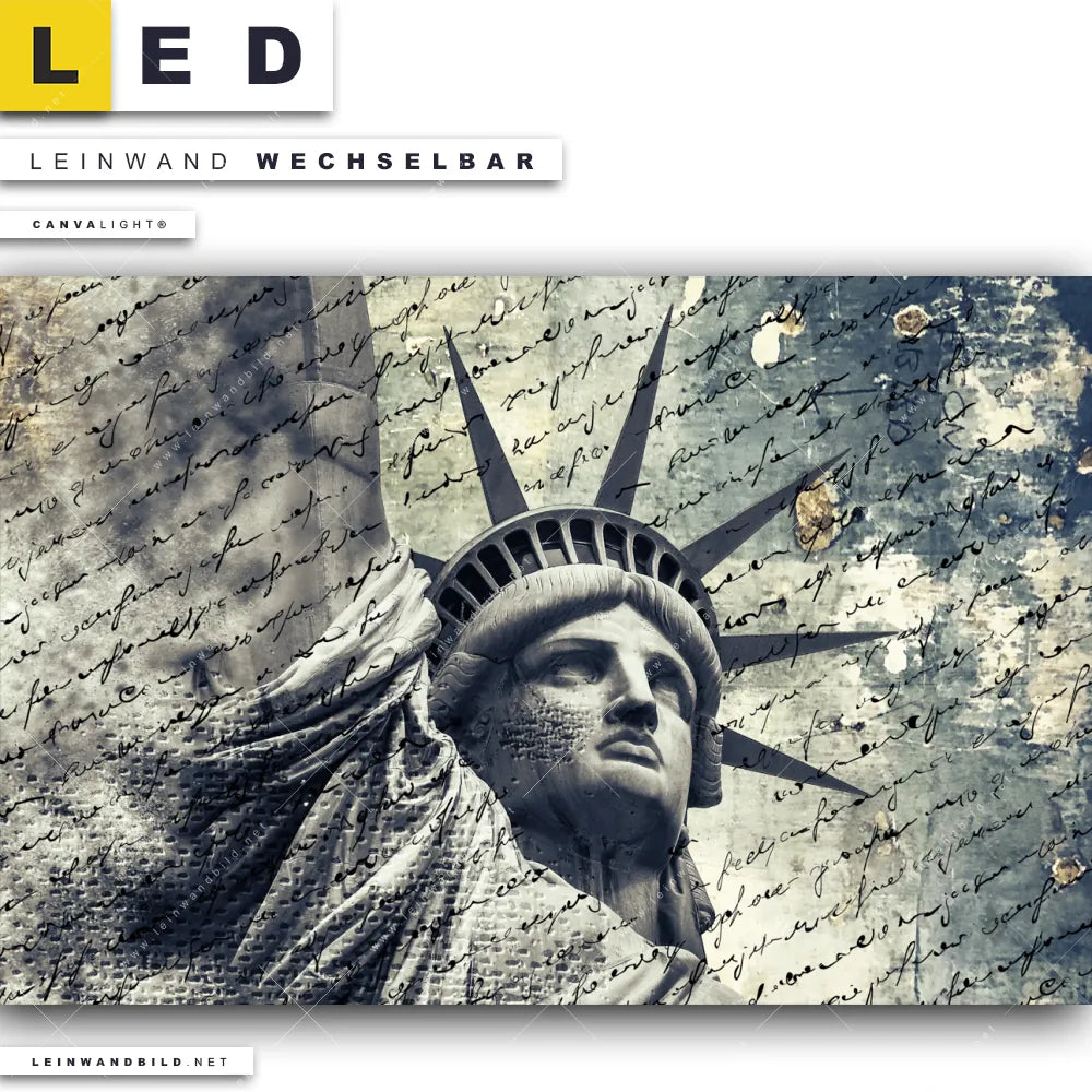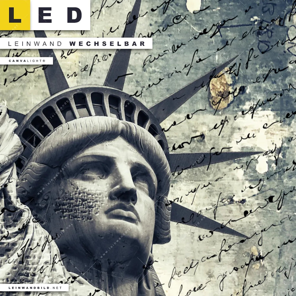 Du bist auf der Suche nach einem Städte - Skylines LED Leinwandbild im Querformat? Begriffe wie Porträt, Grunge, Streetart, modern, Freiheitsstatue, Statue of Liberty, Amerika, USA haben Dich auf der Suche nach Deinem neuen XXL LED Wandbild mit wechselbarer Leinwand inspiriert? Farben wie Blau, Grau , Beige, Weiss, Gold dürfen auf Deinem neuen breiten Leinwand-LED-Bild nicht fehlen und Leuchtbilder im Abstrakt, Grunge, Modern Art Stil passen perfekt zu Deinem Einrichtungsstil?