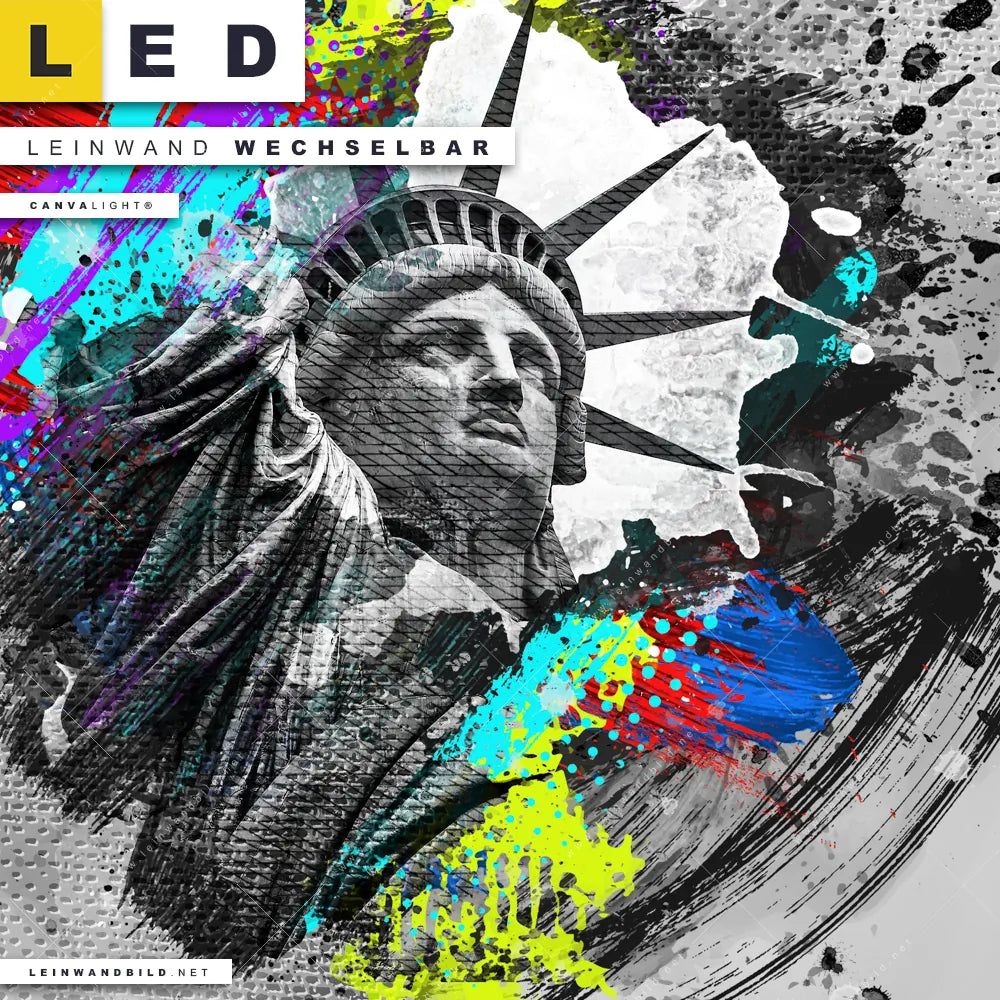 Du bist auf der Suche nach einem Städte - Skylines, Porträts - Menschen LED Leinwandbild im Panorama-Format? Begriffe wie Freiheitsstatue, Statue of Liberty, Pop Art, Kunst, bunt, Amerika, USA haben Dich auf der Suche nach Deinem neuen XXL LED Wandbild mit wechselbarer Leinwand inspiriert? Farben wie Bunt, Rot, Gelb , Blau, Weiss, Grau , Schwarz, Lila, Hellblau dürfen auf Deinem neuen extra breiten Leinwand-LED-Bild nicht fehlen und Leuchtbilder im Abstrakt, Grunge, Modern Art, Pop Art, Street Art Stil passen perfekt zu Deinem Einrichtungsstil?