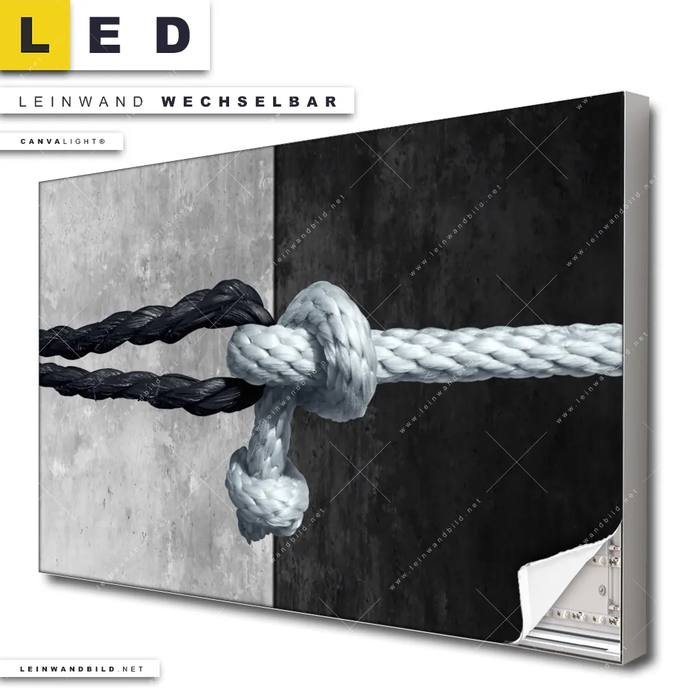 Dann sollte das LED Leinwandbild Canvalight® TEX | Freundschaft & Respekt | Querformat den Weg zu Dir finden. Das stufenlos dimmbare Leinwandbild symbolisch verknotete Seile im steckerfertigen Leuchtrahmen mit Fernbedienung und optionaler Farbtemperatursteuerung fügt sich als Eye-Catcher harmonisch in jedes Arzt - Praxis, Büro - Kanzlei, Flur - Eingangsbereich Raumkonzept ein.