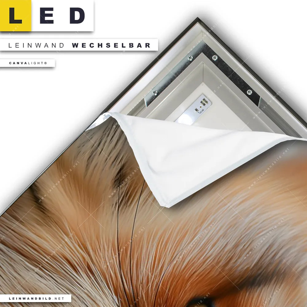 Du konfigurierst Dein individuelles LED Leinwandbild Canvalight® TEX | Friedlicher Fuchs und Blumen | Hochformat und wir produzieren es NEU für Dich. Unsere Tierwelt, Blumen - Botanik LED Bilder mit wechselbarer Textil-Leinwand sind KEINE Lagerware. Du bist Dir unsicher, welches Motiv oder Format das richtige für dein individuelles Canvalight® Leuchtbild ist, dann helfen wir dir gerne weiter und beraten dich!