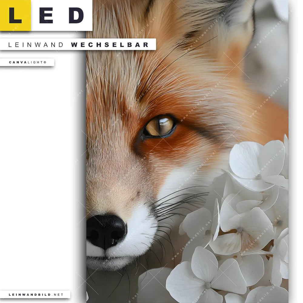 Du bist auf der Suche nach einem Tierwelt, Blumen - Botanik LED Leinwandbild im Hochformat? Begriffe wie Fuchs, Natur, Rotfuchs, Tier, Tierporträt, Blumen, Blüten, Nahaufnahme, Flora haben Dich auf der Suche nach Deinem neuen XXL LED Wandbild mit wechselbarer Leinwand inspiriert? Farben wie Weiss, Orange, Rot dürfen auf Deinem neuen Leinwand-LED-Bild nicht fehlen und Leuchtbilder im Natürlich - Realistisch, Floral Stil passen perfekt zu Deinem Einrichtungsstil?