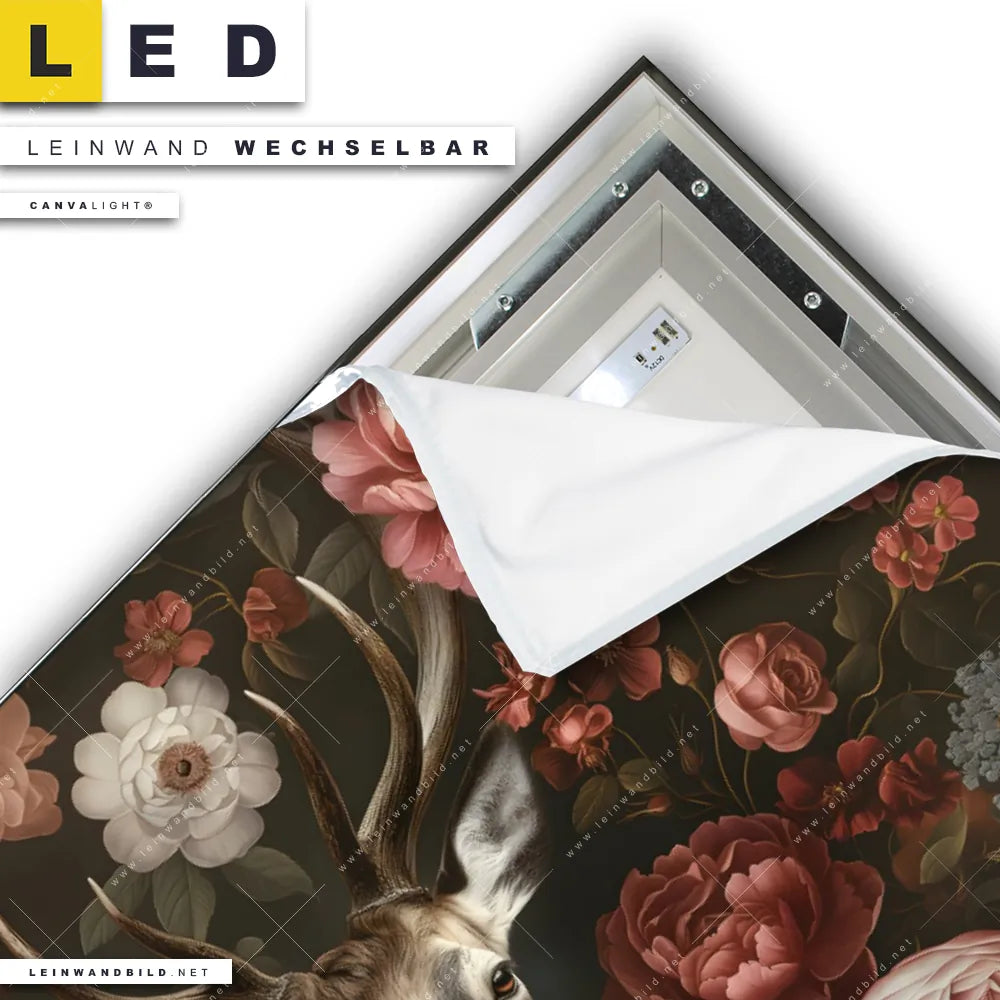 Du bist auf der Suche nach einem Tierwelt, Blumen - Botanik LED Leinwandbild im Querformat? Begriffe wie Tierporträt, Hirsch, Blüten, Rotwild, Geweih, Blumen, Rothirsch, Pfingstrosen haben Dich auf der Suche nach Deinem neuen XXL LED Wandbild mit wechselbarer Leinwand inspiriert? Farben wie Braun, Weiss, Rot dürfen auf Deinem neuen breiten Leinwand-LED-Bild nicht fehlen und Leuchtbilder im Retro - Vintage, Floral Stil passen perfekt zu Deinem Einrichtungsstil?