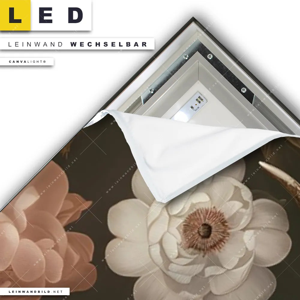 Du konfigurierst Dein individuelles LED Leinwandbild Canvalight® TEX | Friedlicher Hirsch und Blüten | Schmal und wir produzieren es NEU für Dich. Unsere Tierwelt, Blumen - Botanik LED Bilder mit wechselbarer Textil-Leinwand sind KEINE Lagerware. Du bist Dir unsicher, welches Motiv oder Format das richtige für dein individuelles Canvalight® Leuchtbild ist, dann helfen wir dir gerne weiter und beraten dich!