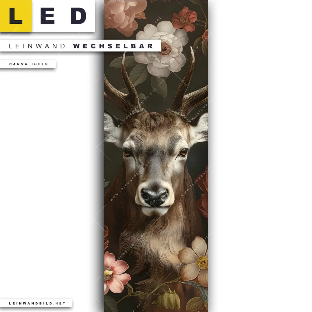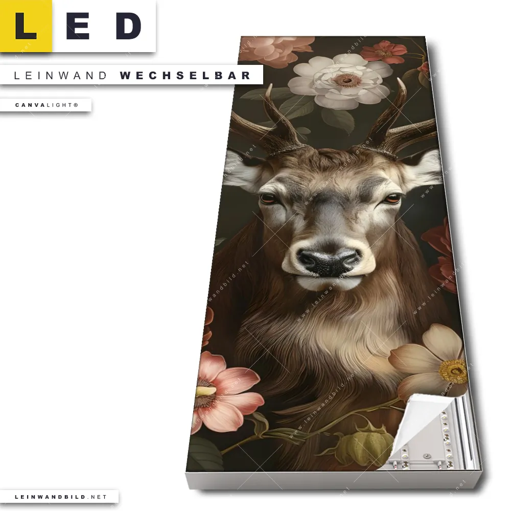Du bist auf der Suche nach einem Tierwelt, Blumen - Botanik LED Leinwandbild im Schmalen Format? Begriffe wie Tierporträt, Hirsch, Blüten, Rotwild, Geweih, Blumen, Rothirsch, Pfingstrosen haben Dich auf der Suche nach Deinem neuen XXL LED Wandbild mit wechselbarer Leinwand inspiriert? Farben wie Braun, Weiss, Rot dürfen auf Deinem neuen Leinwand-LED-Bild im Panorama-Hochformat nicht fehlen und Leuchtbilder im Retro - Vintage, Floral Stil passen perfekt zu Deinem Einrichtungsstil?