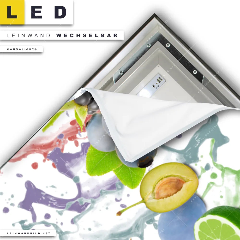 Du konfigurierst Dein individuelles LED Leinwandbild Canvalight® TEX | Fruchtspritzer | Hochformat und wir produzieren es NEU für Dich. Unsere Essen - Trinken LED Bilder mit wechselbarer Textil-Leinwand sind KEINE Lagerware. Du bist Dir unsicher, welches Motiv oder Format das richtige für dein individuelles Canvalight® Leuchtbild ist, dann helfen wir dir gerne weiter und beraten dich!