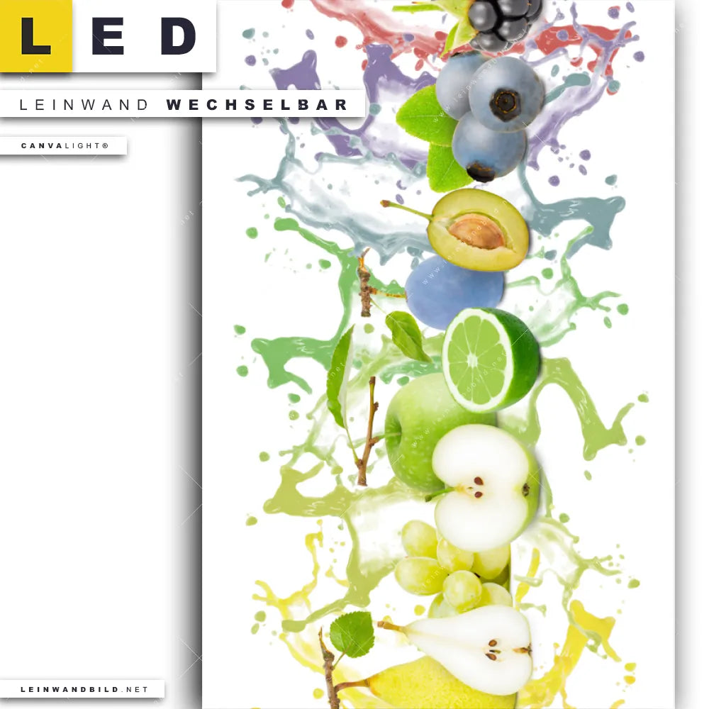 Du bist auf der Suche nach einem Essen - Trinken LED Leinwandbild im Hochformat? Begriffe wie Obst, Zitrusfrüchte, Früchte, Kiwi, frisch, spritzig, Ananas, Spritzwasser, Wasser, Spritzer, Tropfen, Wassertropfen, Orange, Apfel, Zitrone haben Dich auf der Suche nach Deinem neuen XXL LED Wandbild mit wechselbarer Leinwand inspiriert? Farben wie Bunt, Weiss, Blau, Grün, Mint, Orange, Pink, Rot dürfen auf Deinem neuen Leinwand-LED-Bild nicht fehlen und Leuchtbilder im Mixed Media, Modern Art Stil passen perfekt zu Deinem Einrichtungsstil?
