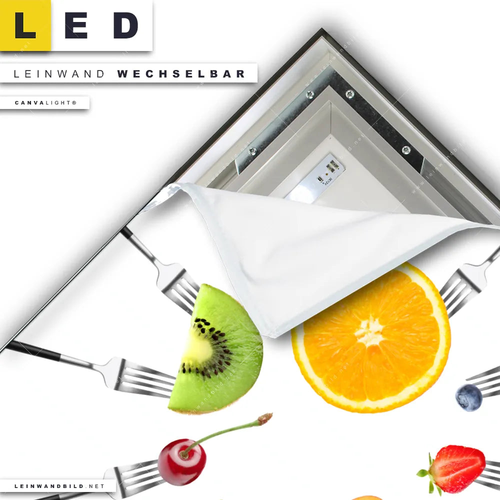 Du konfigurierst Dein individuelles LED Leinwandbild Canvalight® TEX | Früchte auf Gabeln | Quadrat und wir produzieren es NEU für Dich. Unsere Essen - Trinken LED Bilder mit wechselbarer Textil-Leinwand sind KEINE Lagerware. Du bist Dir unsicher, welches Motiv oder Format das richtige für dein individuelles Canvalight® Leuchtbild ist, dann helfen wir dir gerne weiter und beraten dich!