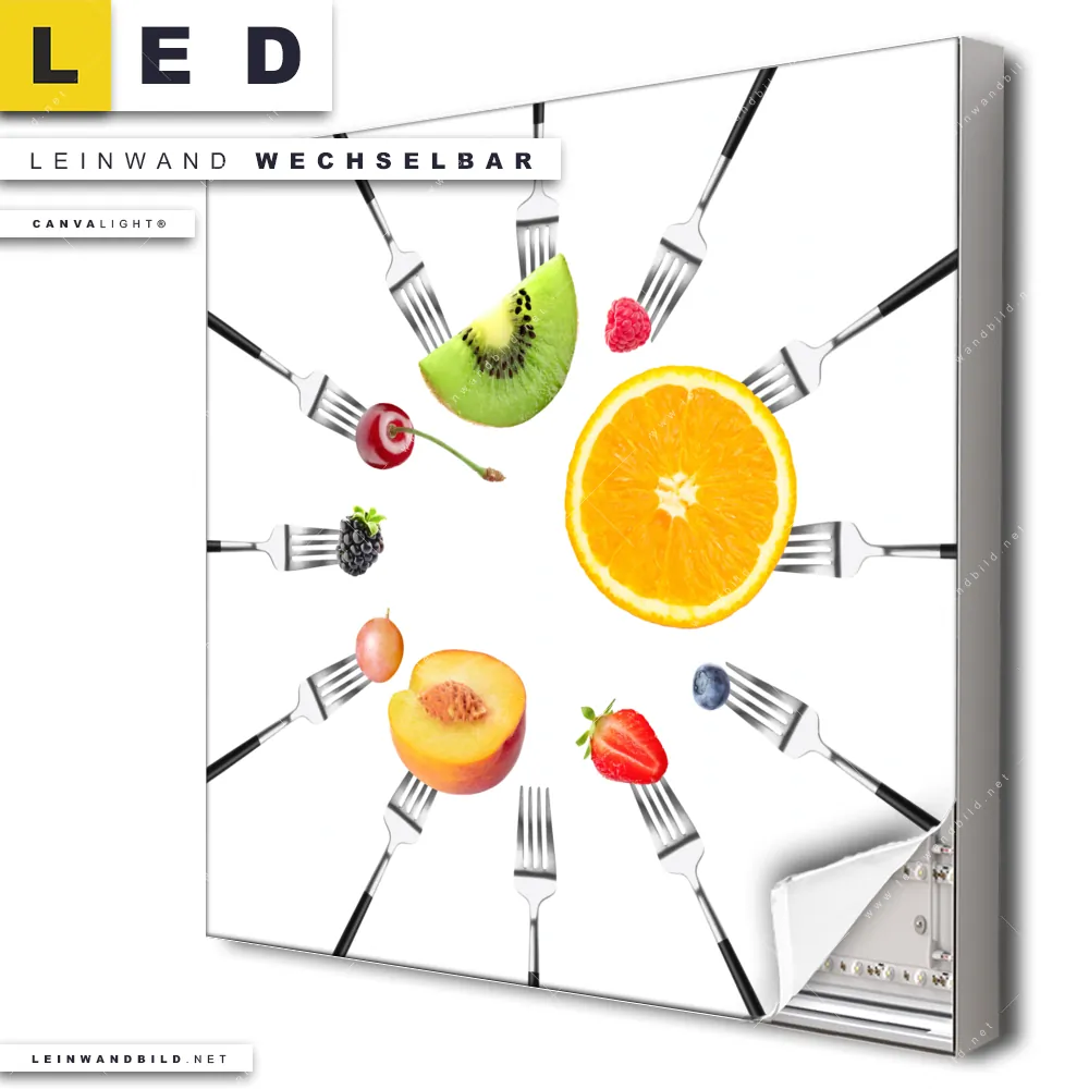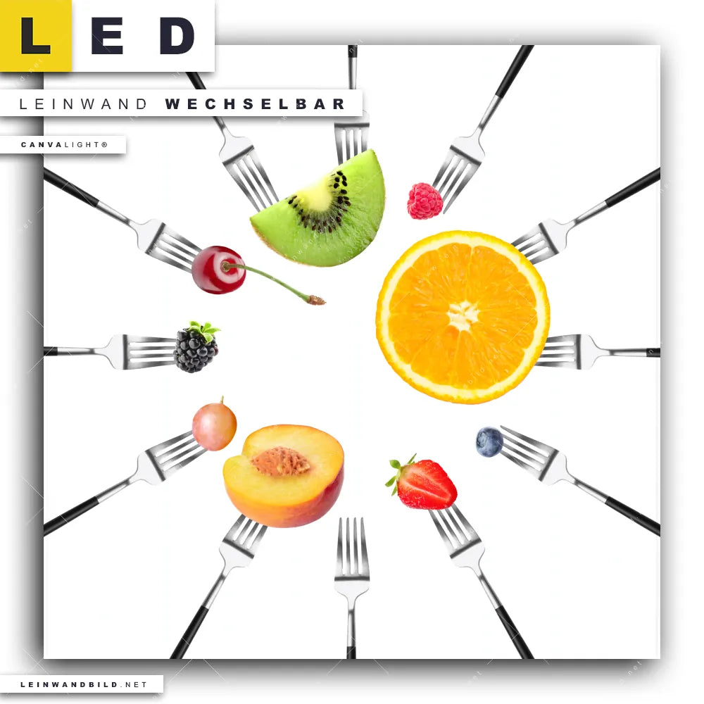 Dann sollte das LED Leinwandbild Canvalight® TEX | Früchte auf Gabeln | Quadrat den Weg zu Dir finden. Das stufenlos dimmbare Leinwandbild Gabeln im Kreis mit frischem Obst im steckerfertigen Leuchtrahmen mit Fernbedienung und optionaler Farbtemperatursteuerung fügt sich als Eye-Catcher harmonisch in jedes Bar - Gastronomie, Küche - Esszimmer Raumkonzept ein.