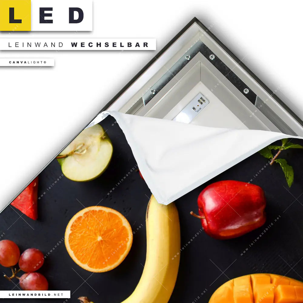 Du konfigurierst Dein individuelles LED Leinwandbild Canvalight® TEX | Früchte - Gesunde Ernährung | Hochformat und wir produzieren es NEU für Dich. Unsere Essen - Trinken LED Bilder mit wechselbarer Textil-Leinwand sind KEINE Lagerware. Du bist Dir unsicher, welches Motiv oder Format das richtige für dein individuelles Canvalight® Leuchtbild ist, dann helfen wir dir gerne weiter und beraten dich!
