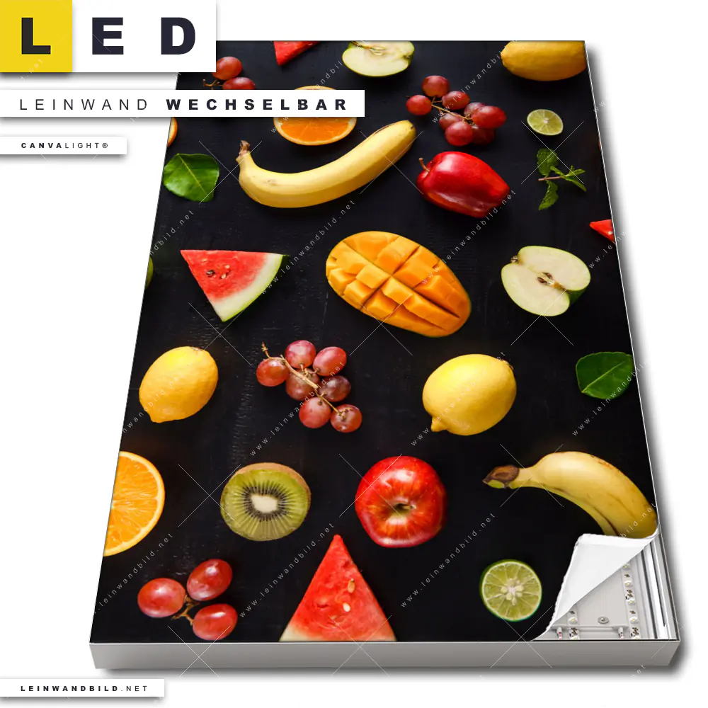 Du bist auf der Suche nach einem Essen - Trinken LED Leinwandbild im Hochformat? Begriffe wie Obst, Zitrusfrüchte, Früchte, frisch, spritzig, Orange, Apfel, Zitrone, Banane, Trauben, Melone haben Dich auf der Suche nach Deinem neuen XXL LED Wandbild mit wechselbarer Leinwand inspiriert? Farben wie Schwarz, Gelb , Orange, Rot, Grün dürfen auf Deinem neuen Leinwand-LED-Bild nicht fehlen und Leuchtbilder im Natürlich - Realistisch Stil passen perfekt zu Deinem Einrichtungsstil?