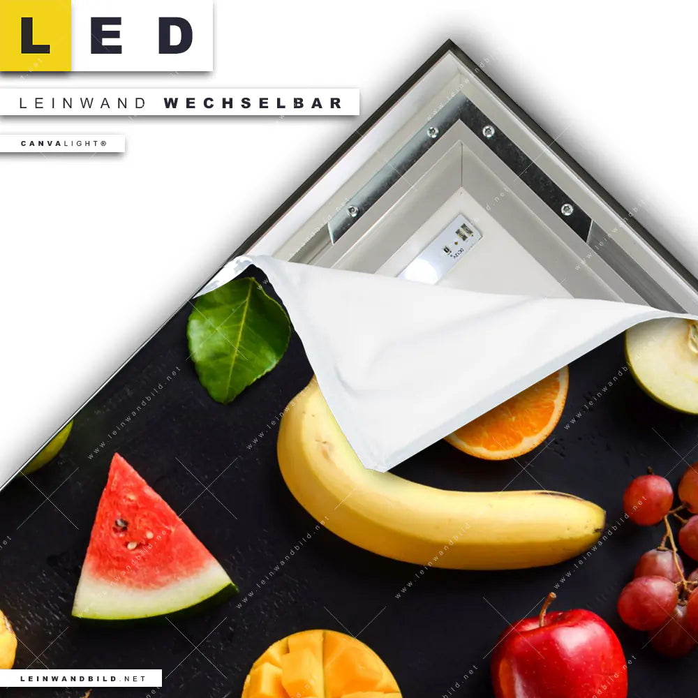 Du konfigurierst Dein individuelles LED Leinwandbild Canvalight® TEX | Früchte - Gesunde Ernährung | Quadrat und wir produzieren es NEU für Dich. Unsere Essen - Trinken LED Bilder mit wechselbarer Textil-Leinwand sind KEINE Lagerware. Du bist Dir unsicher, welches Motiv oder Format das richtige für dein individuelles Canvalight® Leuchtbild ist, dann helfen wir dir gerne weiter und beraten dich!