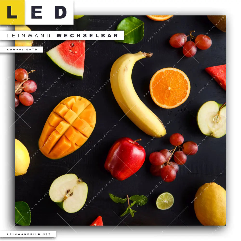 Du bist auf der Suche nach einem Essen - Trinken LED Leinwandbild im Quadratischen Format? Begriffe wie Obst, Zitrusfrüchte, Früchte, frisch, spritzig, Orange, Apfel, Zitrone, Banane, Trauben, Melone haben Dich auf der Suche nach Deinem neuen XXL LED Wandbild mit wechselbarer Leinwand inspiriert? Farben wie Schwarz, Gelb , Orange, Rot, Grün dürfen auf Deinem neuen Leinwand-LED-Bild nicht fehlen und Leuchtbilder im Natürlich - Realistisch Stil passen perfekt zu Deinem Einrichtungsstil?